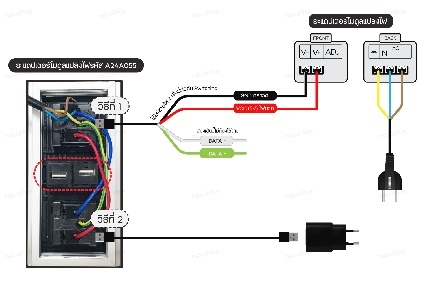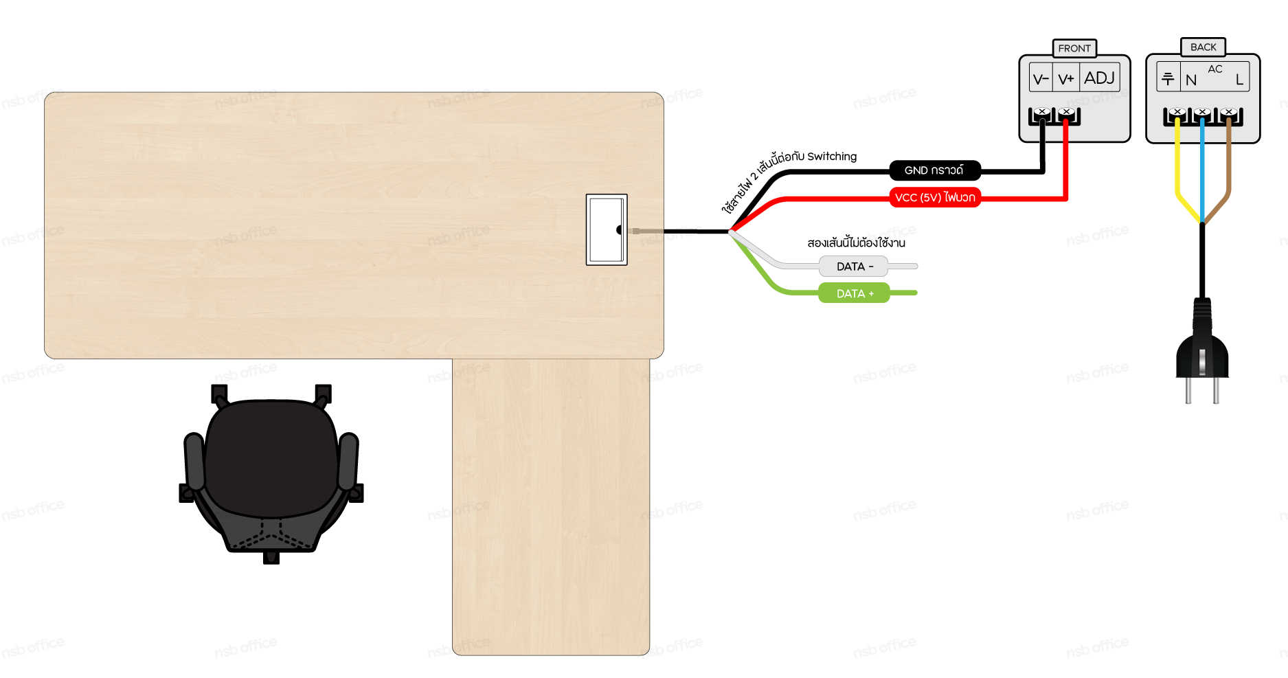 นำสองเส้นนี้เดินต่อไปยังช่อง USB ของปลั๊กป็อปอัพแต่ละตัว โดยต่อเข้าที่ขั้วจ่ายไฟบวกและกราวด์เหมือนในภาพ ส่วนสาย DATA+ (สีเขียว) และ DATA– (สีขาว) ไม่ต้องต่อเช่นกัน