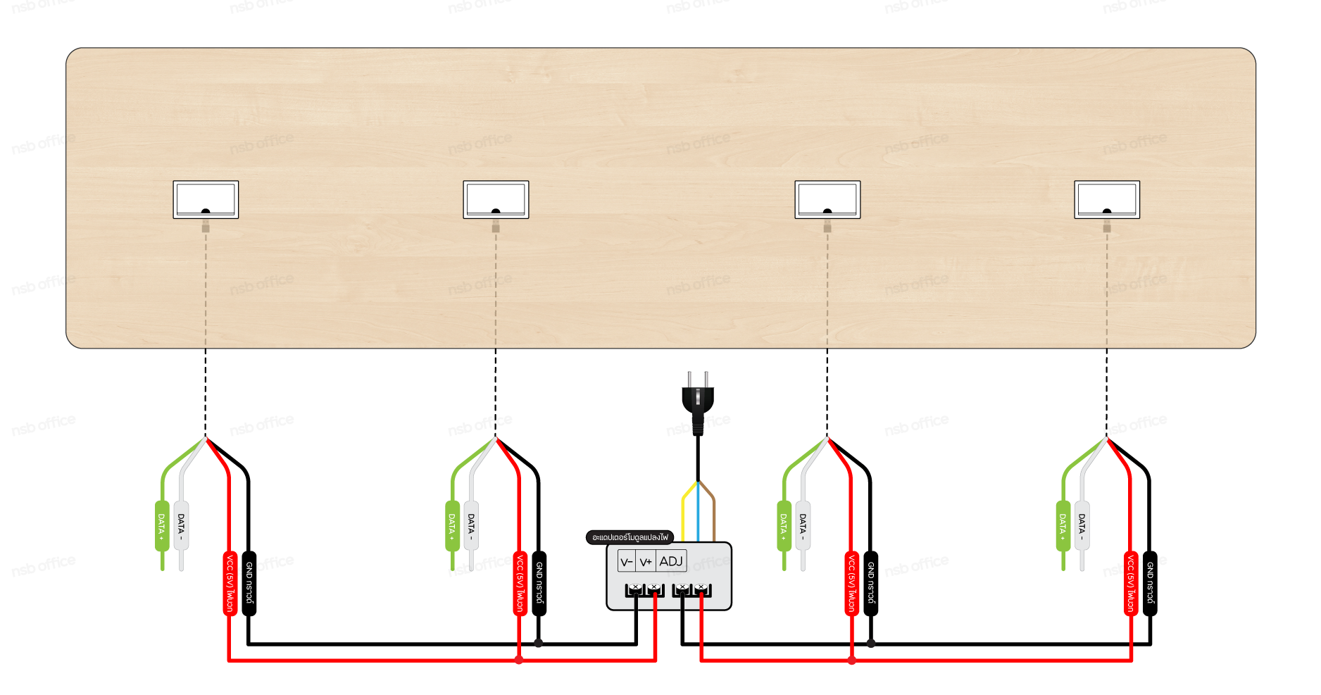 ถ้าหน้างานต้องการให้ปลั๊กป็อปอัพหลายตัวใช้งานได้พร้อมกัน และอยากให้จ่ายไฟจากหัวปลั๊กเพียงหัวเดียว เพื่อความเรียบร้อยและลดจำนวนอะแดปเตอร์ใต้โต๊ะ สามารถใช้ วิธีต่อผ่าน Switching Power Supply (AC/DC) ได้