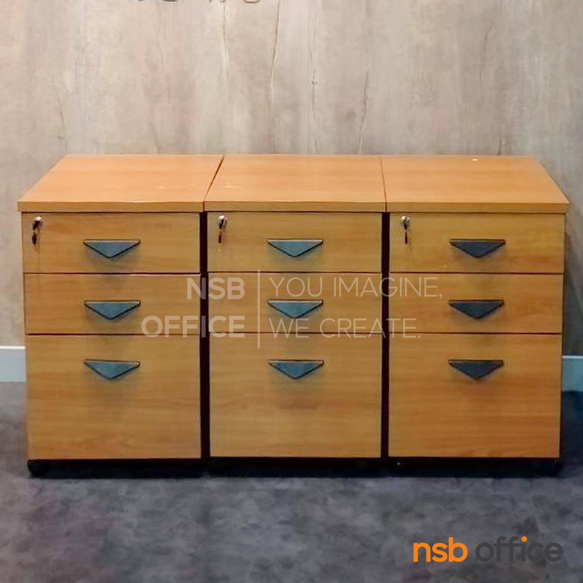 3 ลิ้นชัก Central Lock ลิ้นชักล่างใส่แฟ้มแขวนได้ / มือจับพลาสติก สามเหลี่ยมสีดำ / ล้อเลื่อน / TOP หนา 25 มม. ปิดผิวเมลลามีน กันชื้น กันร้อน