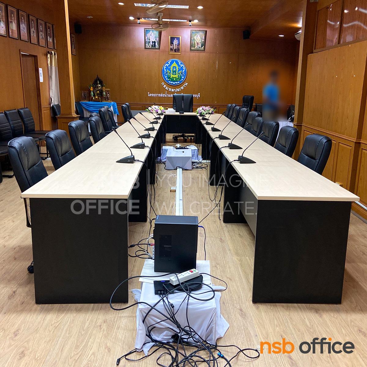 ประกอบด้วยโต๊ะประชุมตรง 180W*60D*75H cm. (จำนวน 4 ตัว) ,โต๊ะประชุมตรง 150W*60D*75H cm. (จำนวน 2 ตัว) และครึ่งวงกลม Di60*75H cm. (จำนวน 4 ตัว)