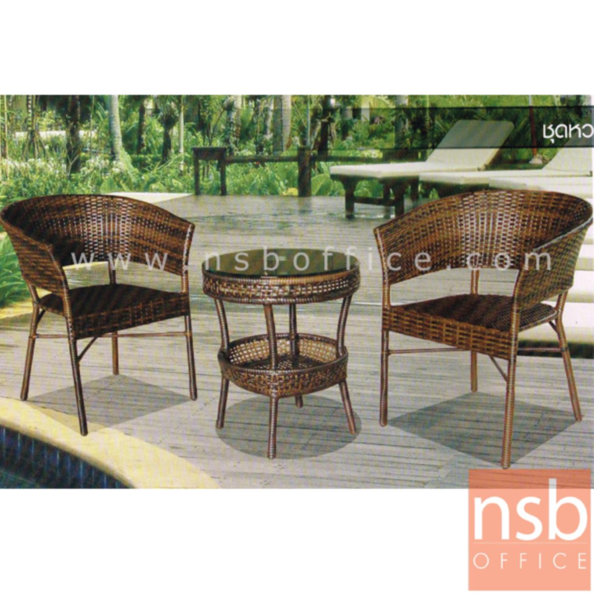 1 ชุดประกอบด้วย โต๊ะหวายเทียมหน้าTOPกระจก ขนาด 50Di*50H cm. / เก้าอี้หวายเทียม ขนาด 54W*60D*76H cm.