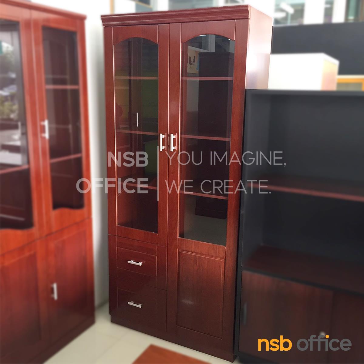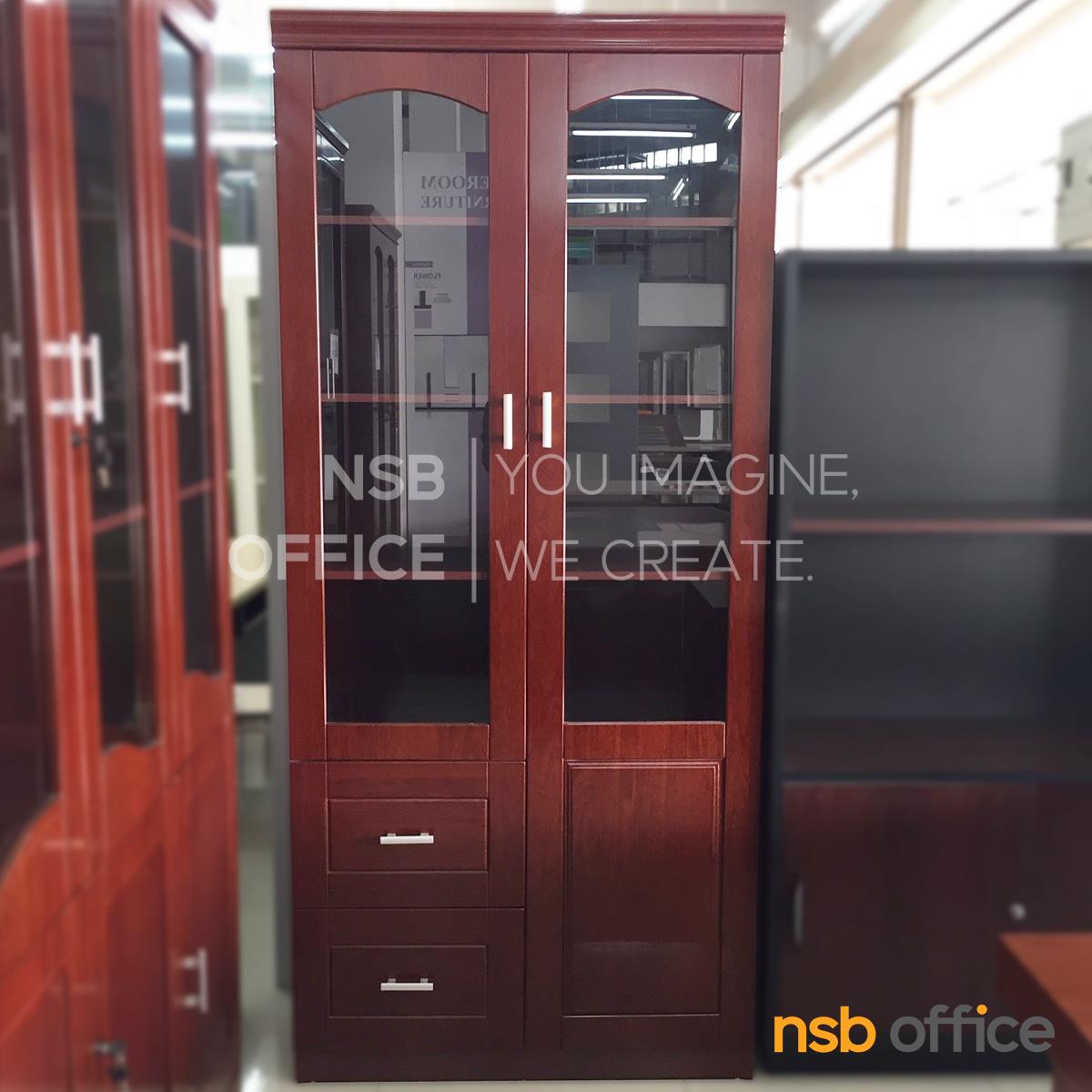 โครงตู้ผลิตไม้ MDF เคลือบสีสัก / มี 2 บานเปิดบนกระจก ล่าง 2 ลิ้นชักซ้าย
