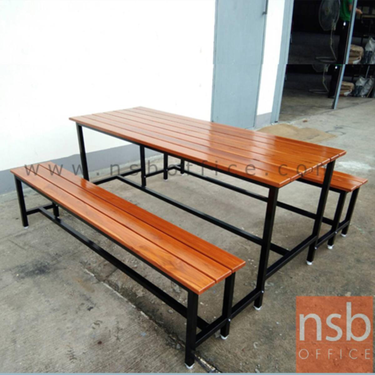 โต๊ะ /ชุดโต๊ะโรงอาหารหน้าไม้สักทองดีระแนง แบบขาเชื่อมติดกันโดยใช้ก้ามปูยืดติด