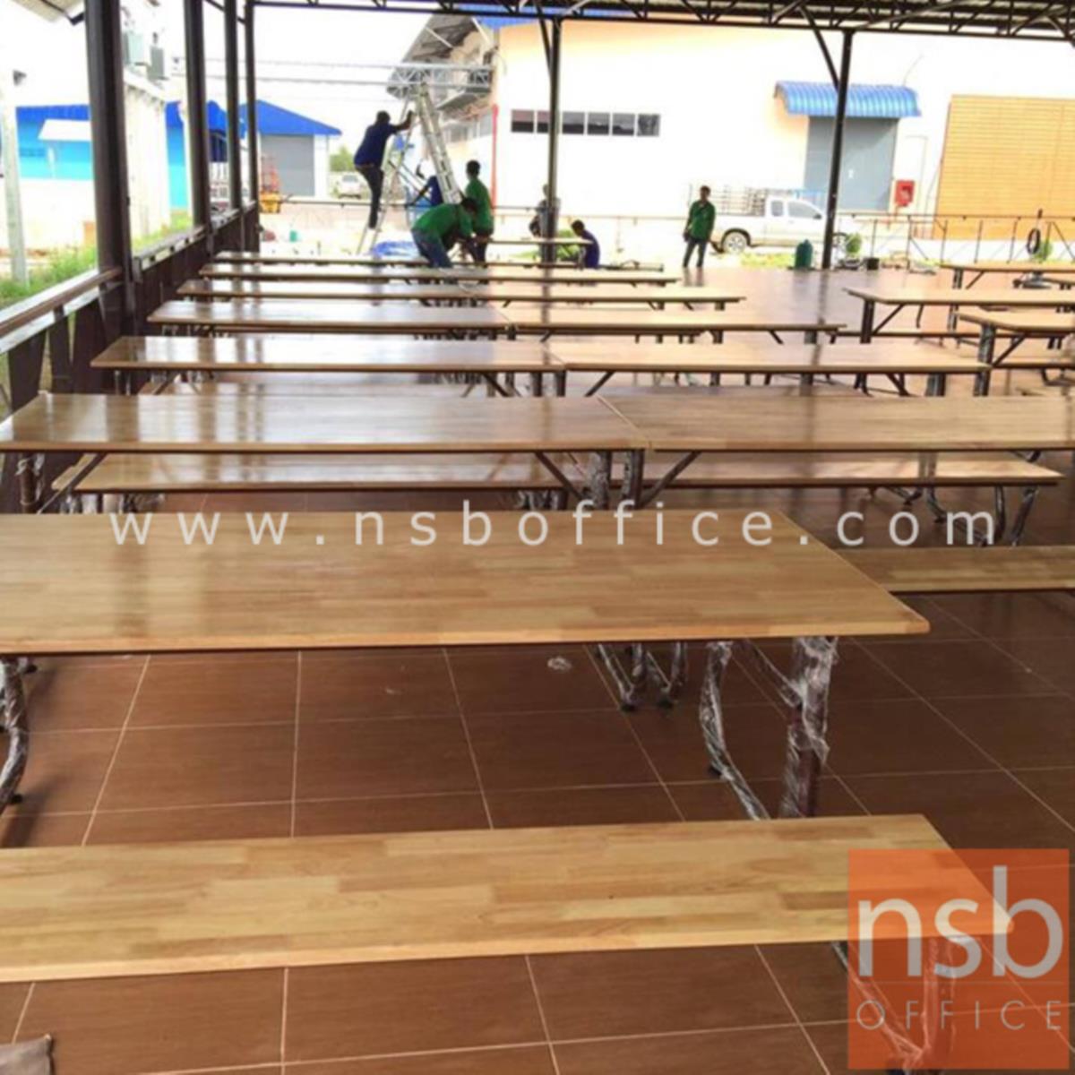 ชุดโต๊ะโรงอาหารหน้าไม้สักแผ่นเดียว แบบขาเชื่อมติดกันเป็นตัวเจ /แข็งแรง / ผลิตสีพ่นน้ำตาล