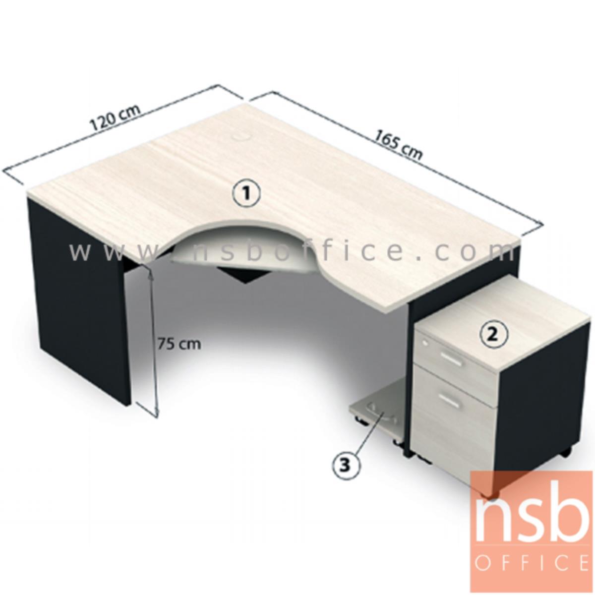 โต๊ะผู้บริหารตัวแอล ระดับกลาง ประกอบด้วย โต๊ะทำงาน ตัวแอล 165 ซม. พร้อมรางคีย์บอร์ด ตู้เสริมข้าง 2 ลิ้นชัก ที่วางซีพียู