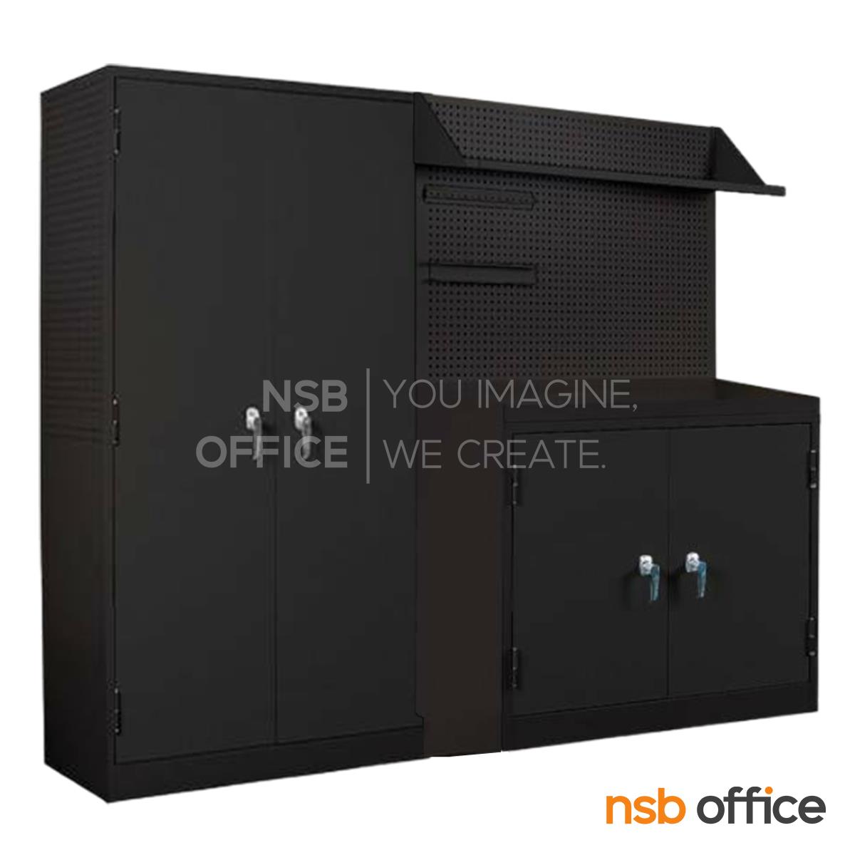 1 ชุด ประกอบด้วย ตู้เก็บเครื่องมือช่าง 2 บานเปิดสูง , ตู้เก็บเครื่องมือช่าง 2 บานเปิดเตี้ย พร้อมแผ่น TOP และชุดตะแกรงเหล็กเจาะรู พร้อมแผ่นชั้นและอุปกรณ์เสริมสำหรับเก็บเครื่องมือ /ผลิตจากเหล็กหนา 0.7 มม. พ่นสีฝุ่นหนา 60 ไมครอน / ทนทานกันสนิม / เหมาะสำหรับการใช้งานในโรงงาน