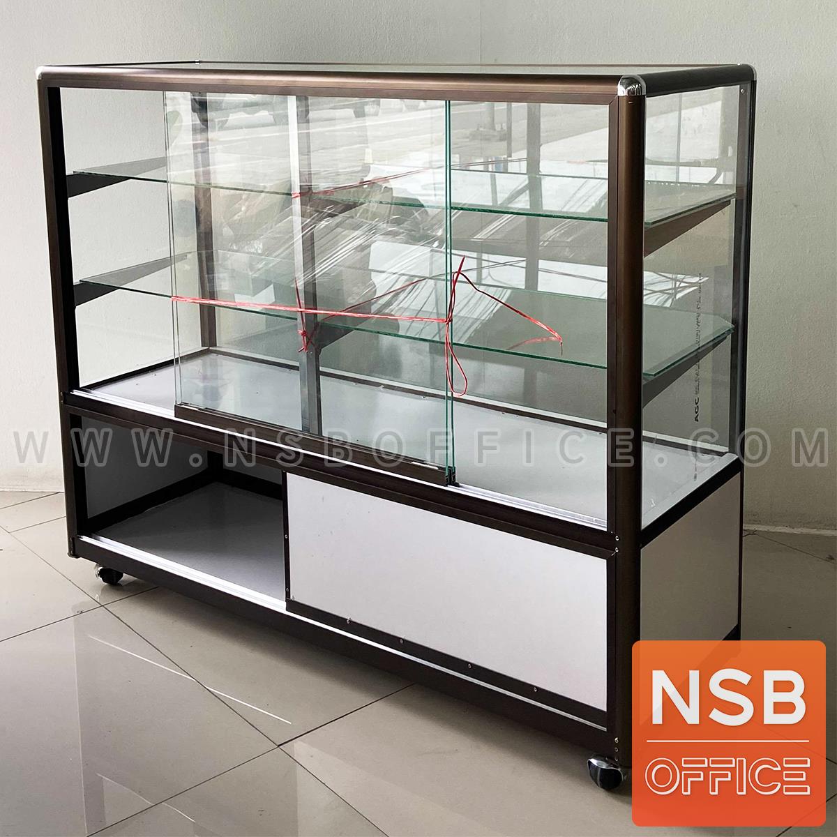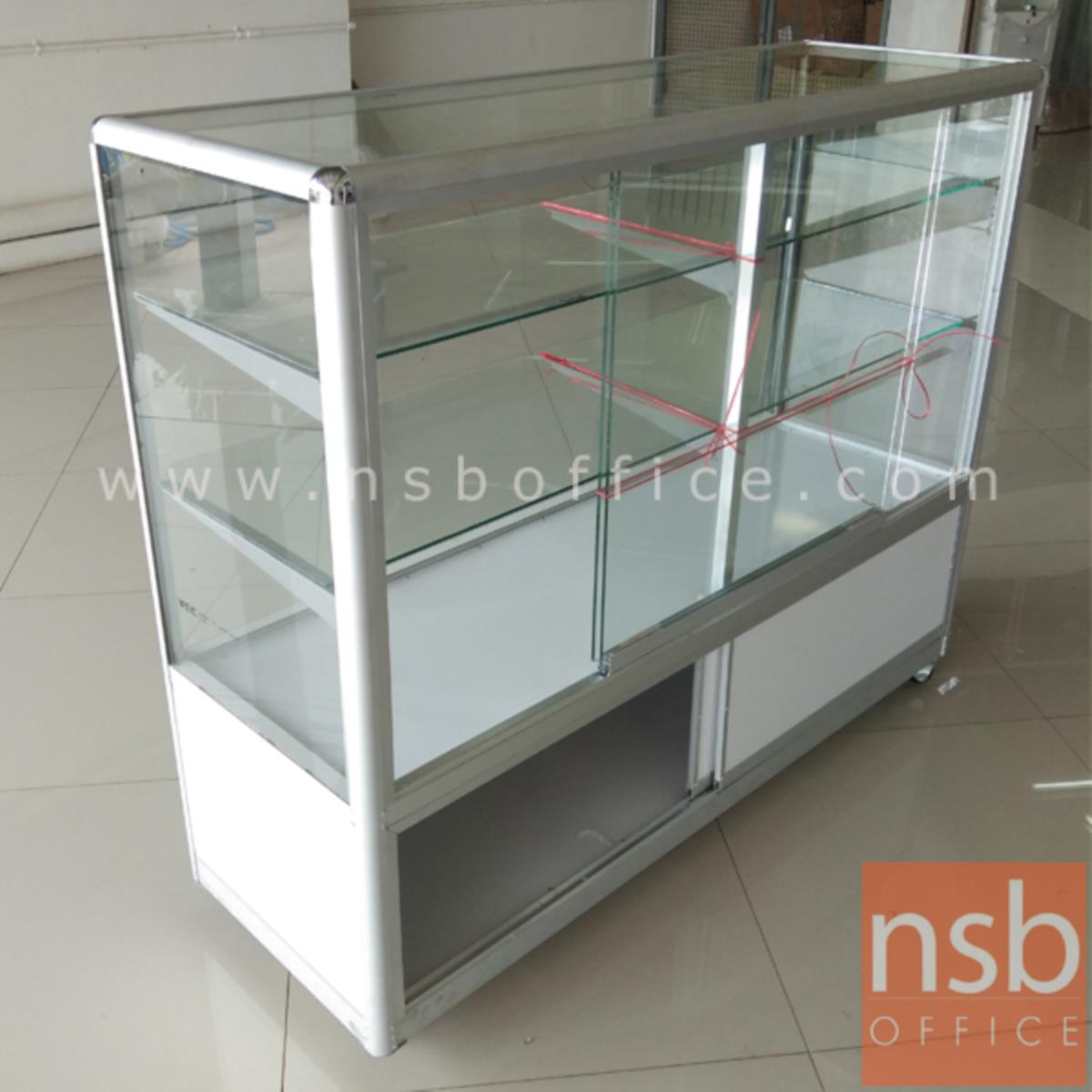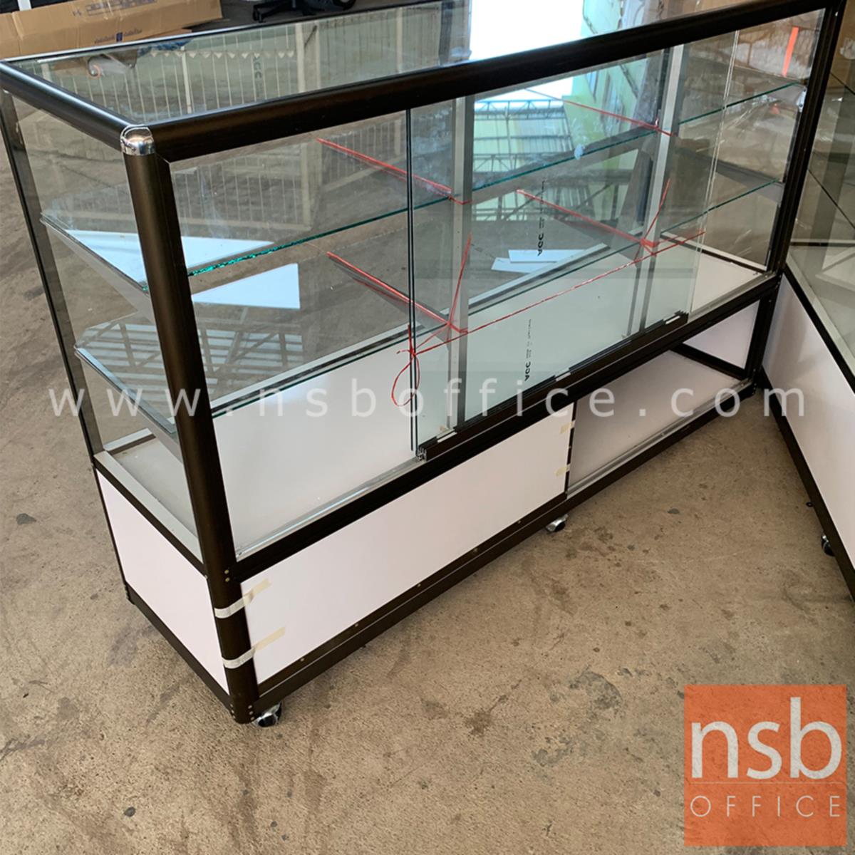 G06A055: ตู้กระจกโชว์สินค้า มีช่องเก็บของด้านล่าง สูง 100 ซม. โครงอลูมิเนียมมุมมน ล้อเลื่อน