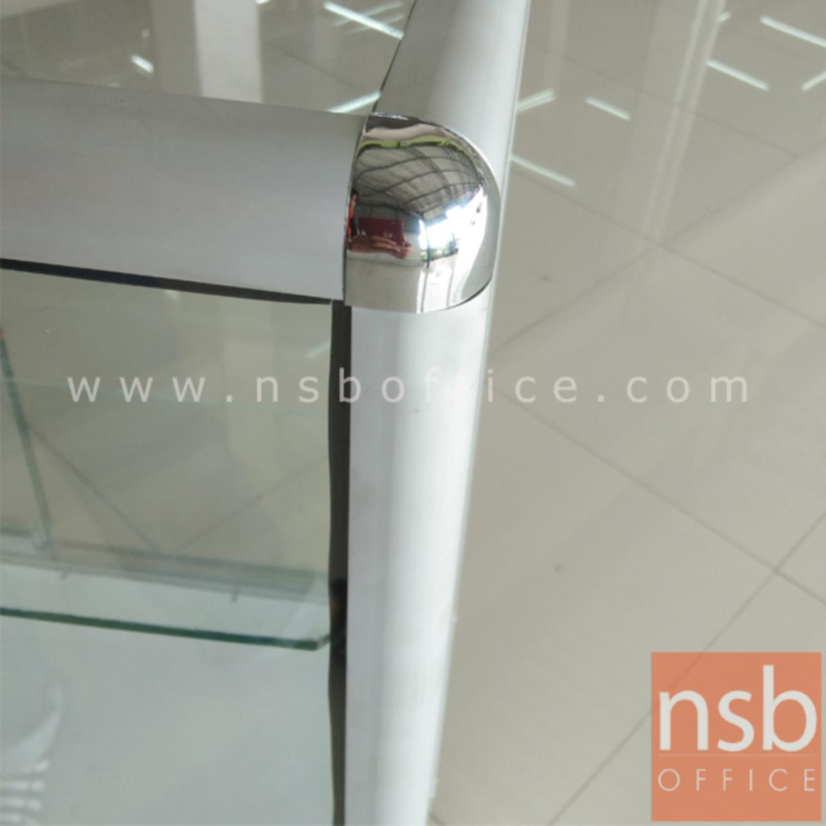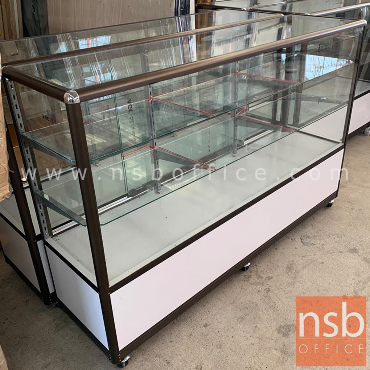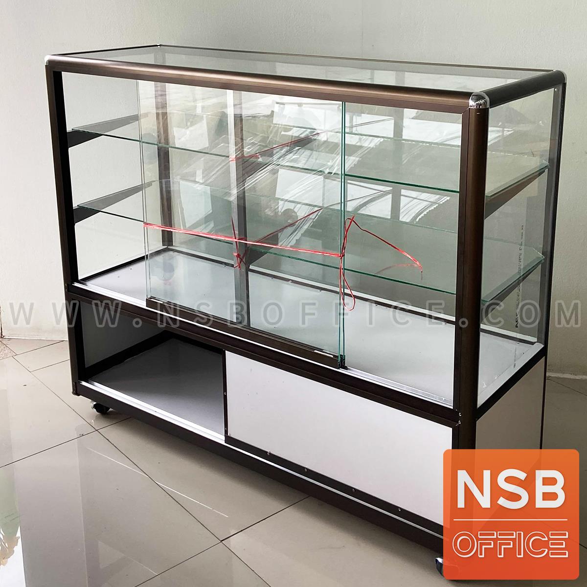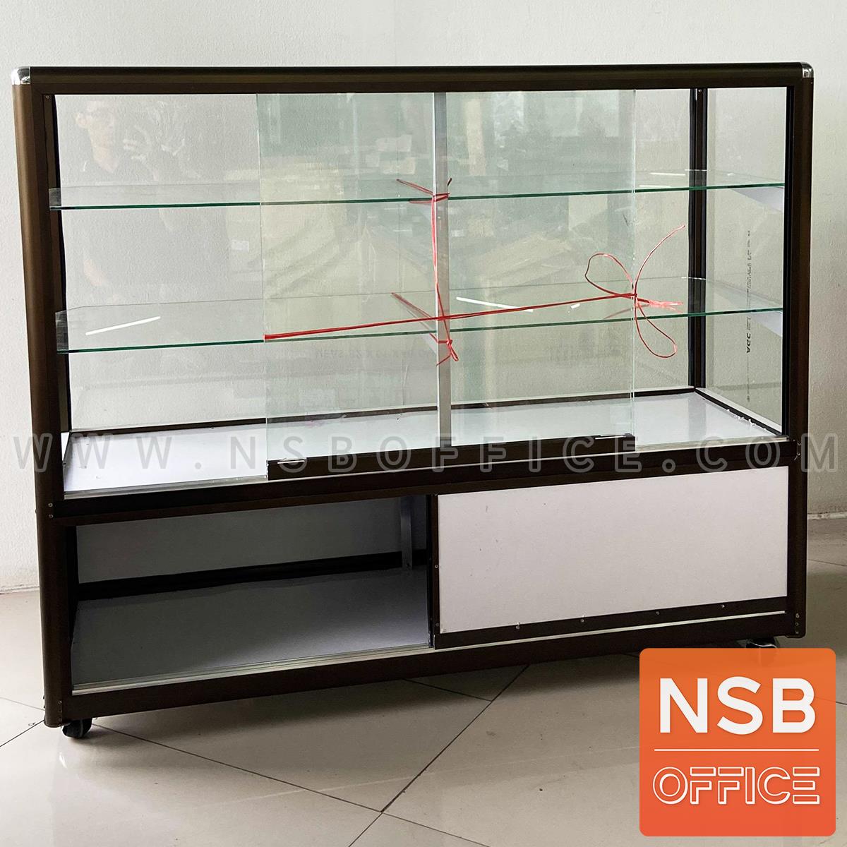 G06A055: ตู้กระจกโชว์สินค้า มีช่องเก็บของด้านล่าง สูง 100 ซม. โครงอลูมิเนียมมุมมน ล้อเลื่อน