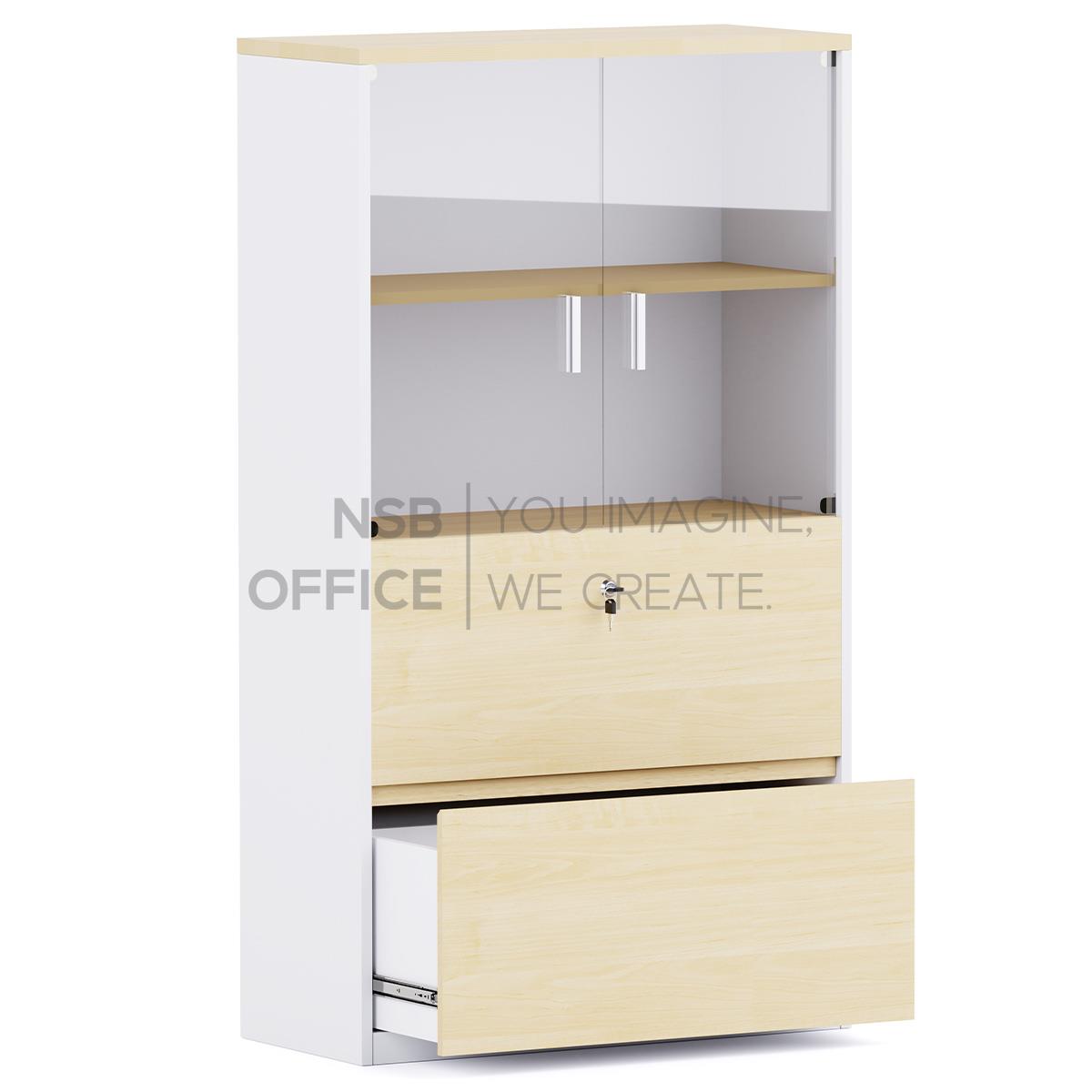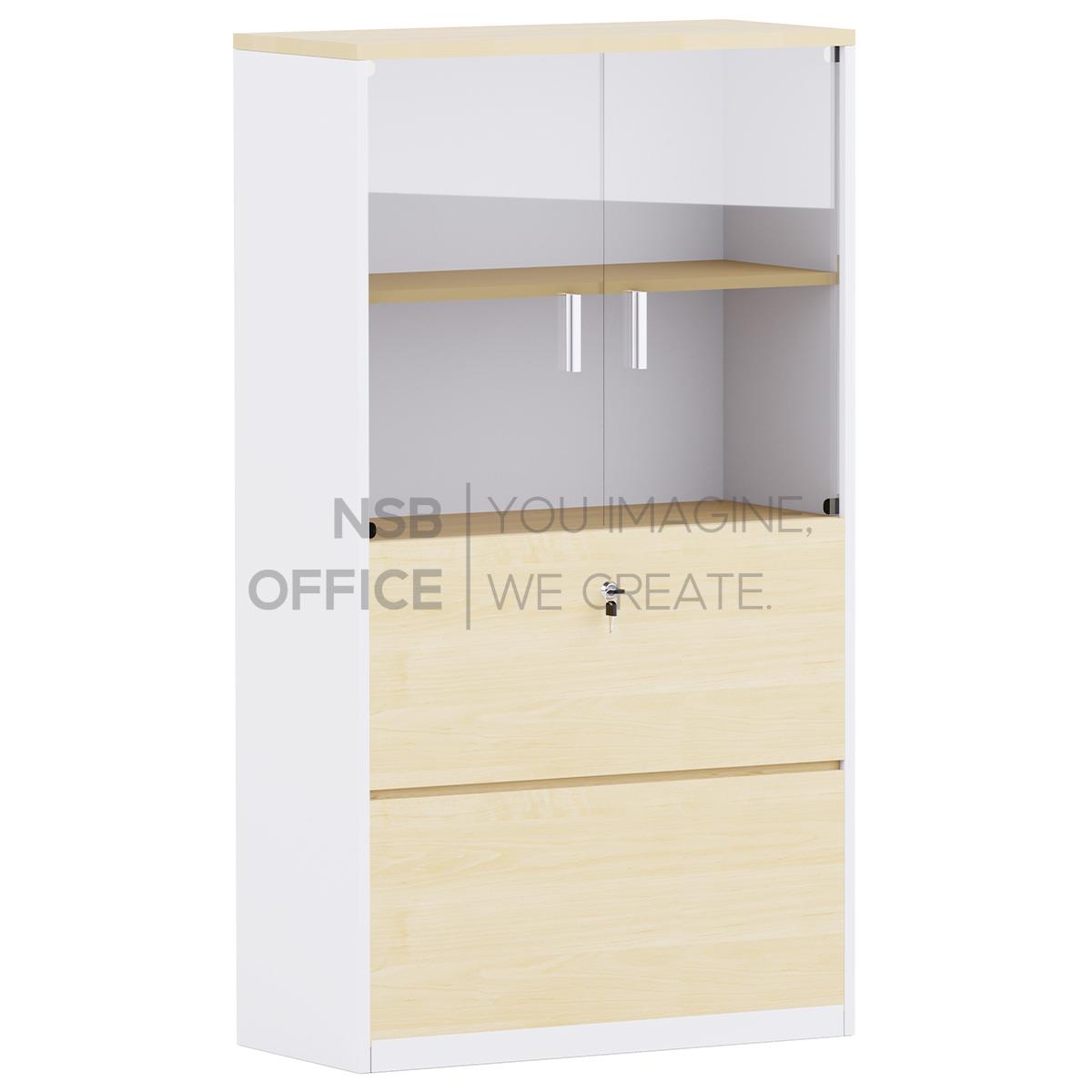 C02A068: ตู้เอกสาร 2 บานกระจก 2 ลิ้นชักแฟ้มแขวน รุ่น EP-011 สูง 160 cm. เมลามีน บานเพ่