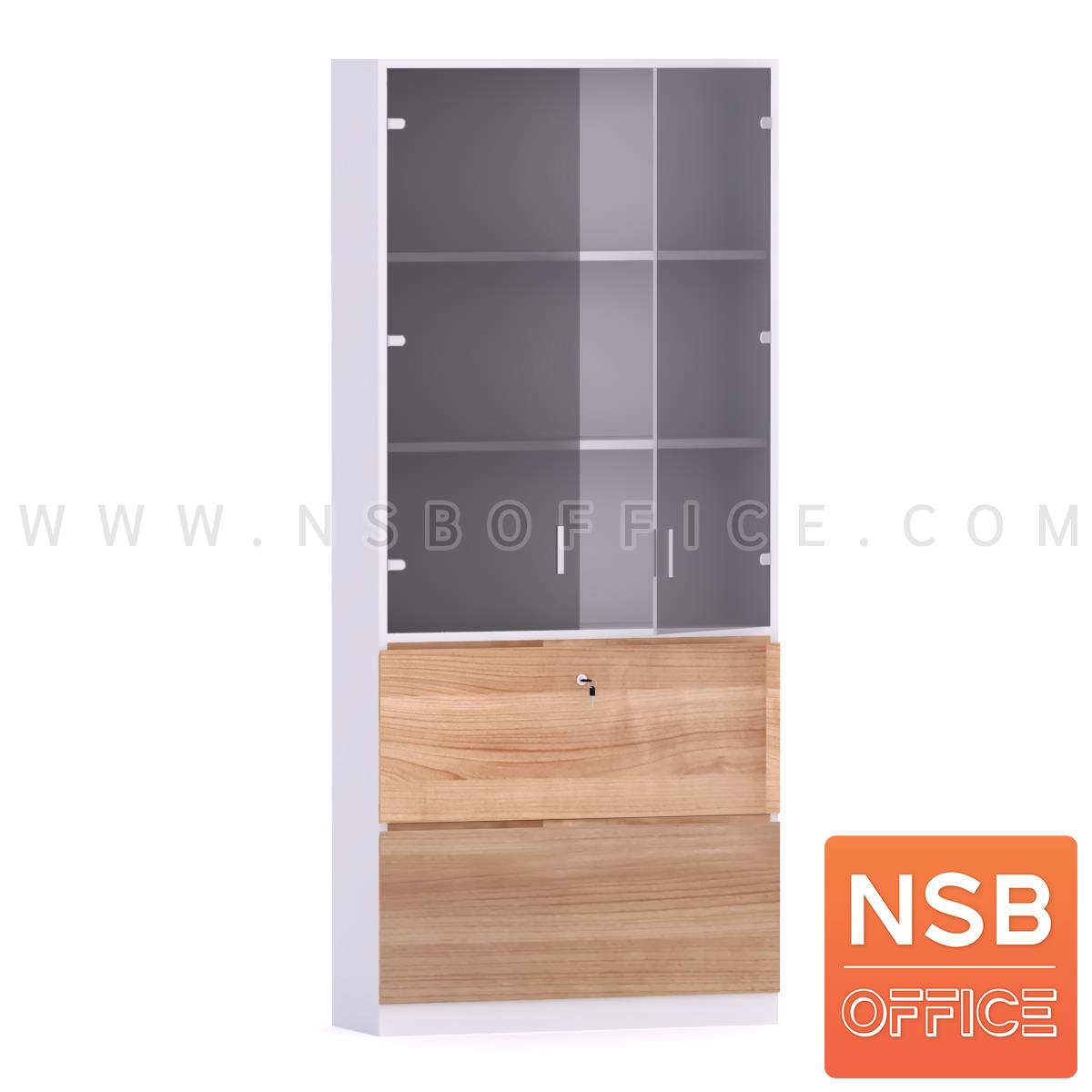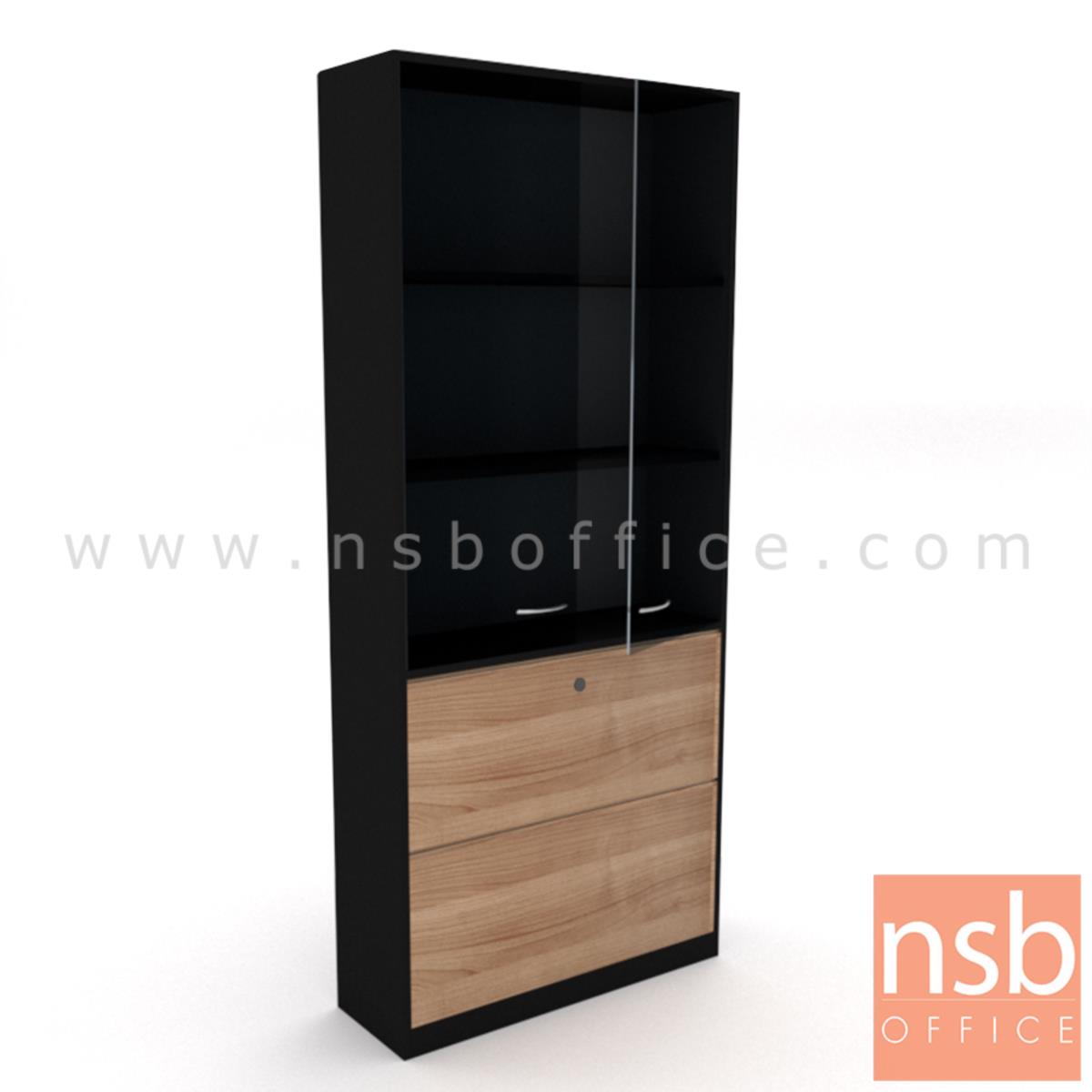 : ตู้เอกสาร 5 ชั้น บนบานเปิดกระจก ล่างลิ้นชักบานเพ่แฟ้มแขวน รุ่น EP-3029 สูง 200 cm. (รางลูกปืน รับ นน. ได้มาก ลิ้นชัก Soft close)