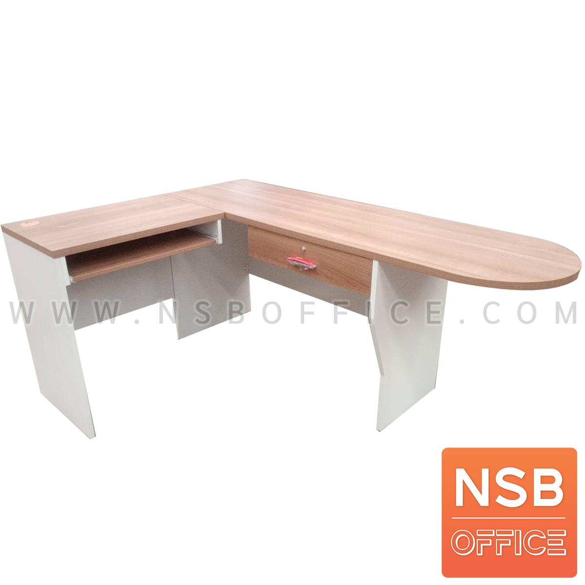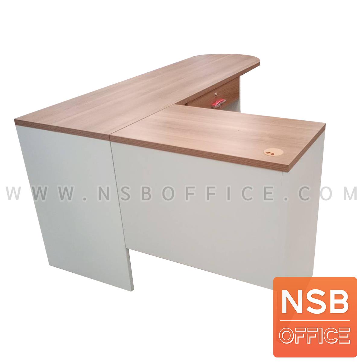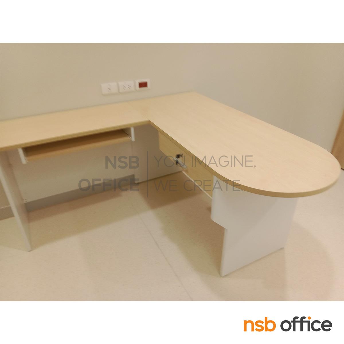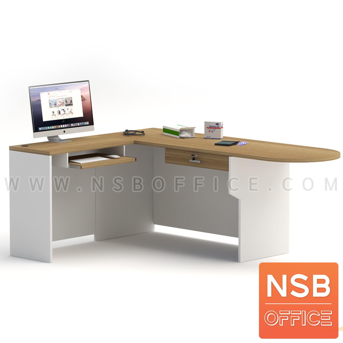 : โต๊ะแพทย์ในห้องตรวจ รุ่น Mashiho (มาชิโฮะ) ขนาด 150W1*140W2 cm (หน้าท็อปสี่เหลี่ยมหัวโค้ง) พร้อมรางคีย์บอร์ดและลิ้นชัก