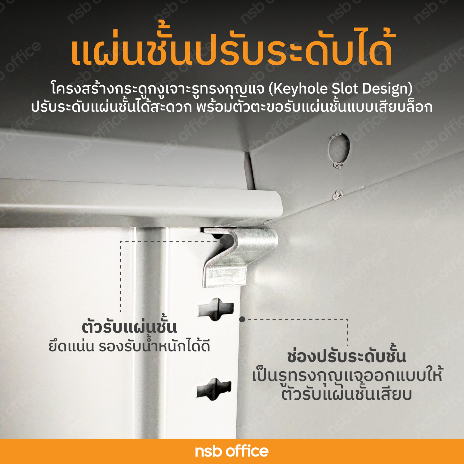 โครงสร้างกระดูกงูเจาะรูทรงกุญแจ (Keyhole Slot Design) เพื่อให้สามารถปรับระดับแผ่นชั้นได้อย่างสะดวกและแม่นยำ พร้อมติดตั้ง ตัวตะขอรับแผ่นชั้นแบบเสียบล็อก ที่ออกแบบให้เข้าล็อกกับร่องกุญแจได้แน่นหนา