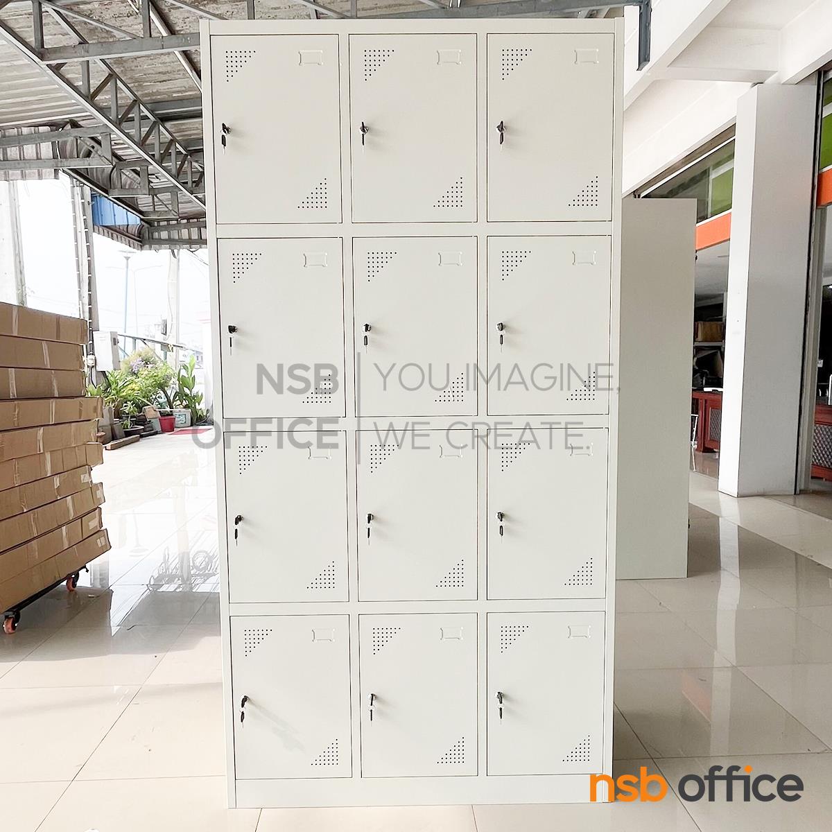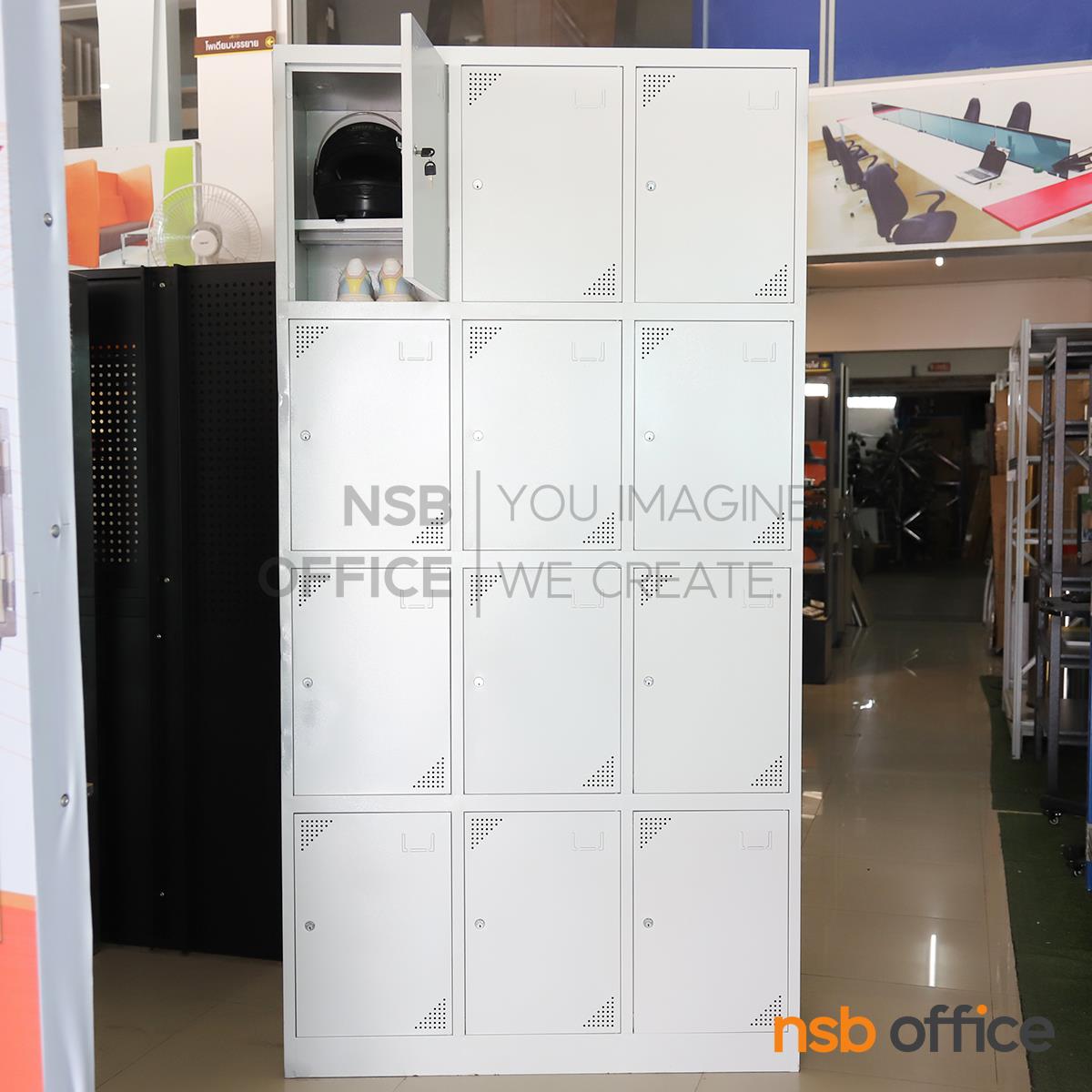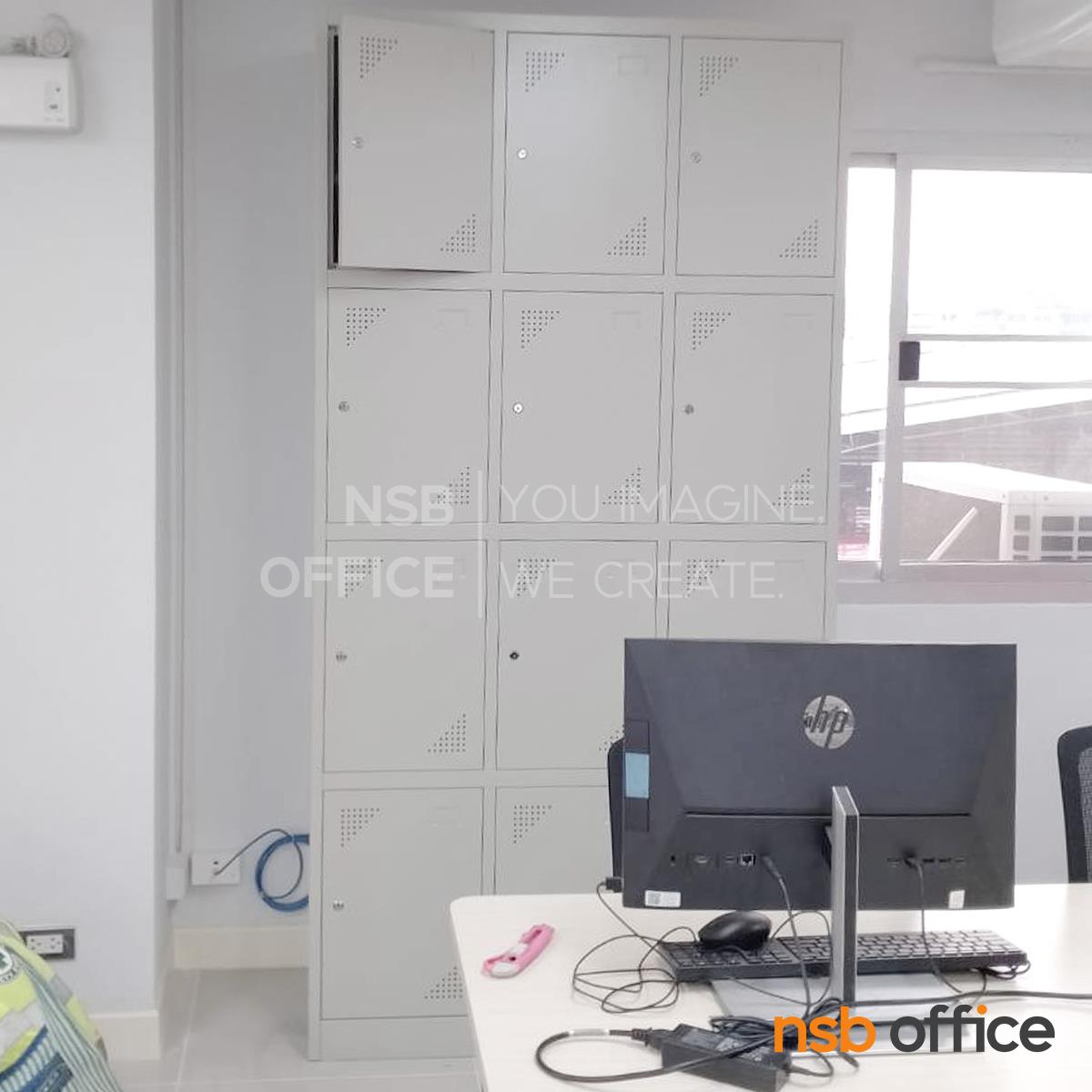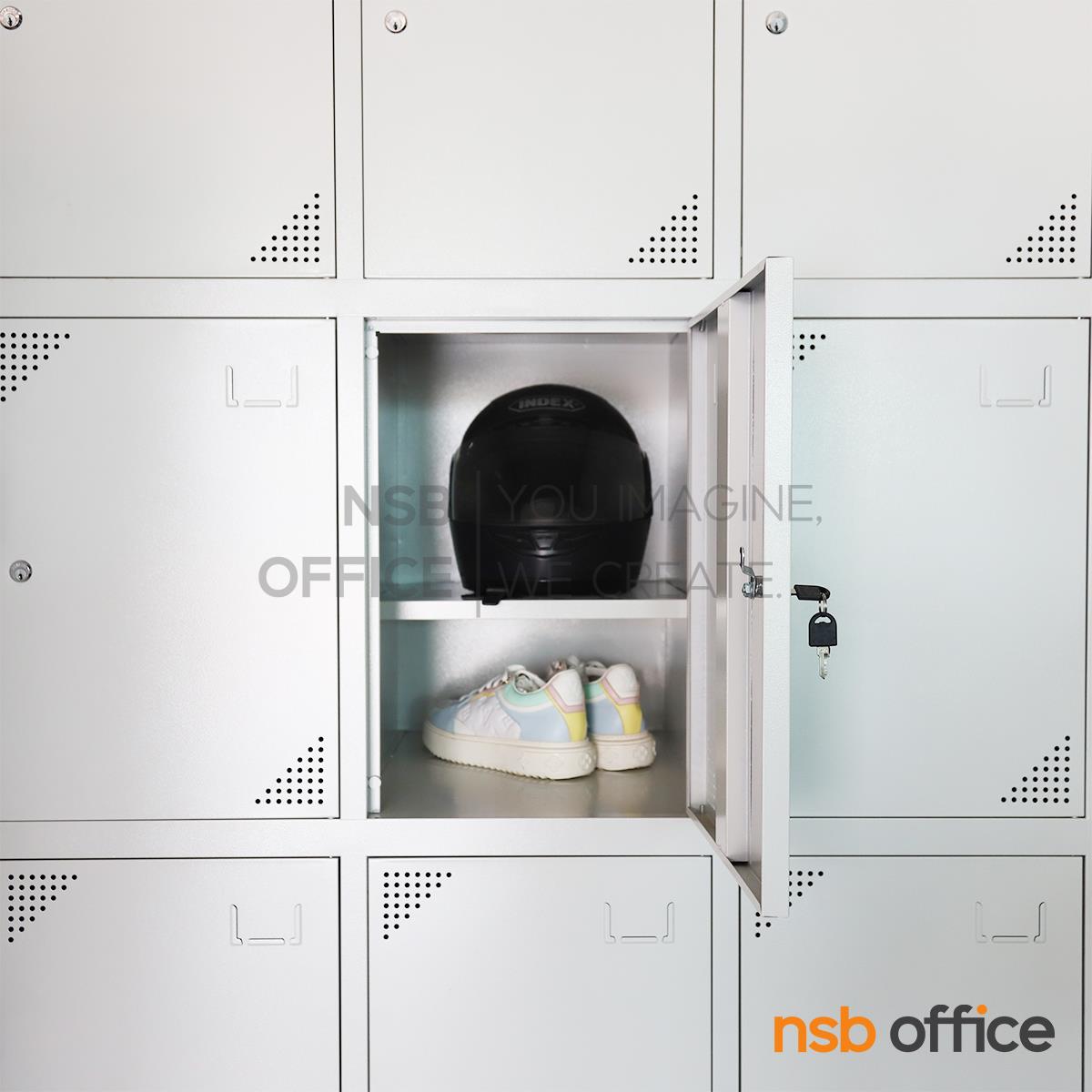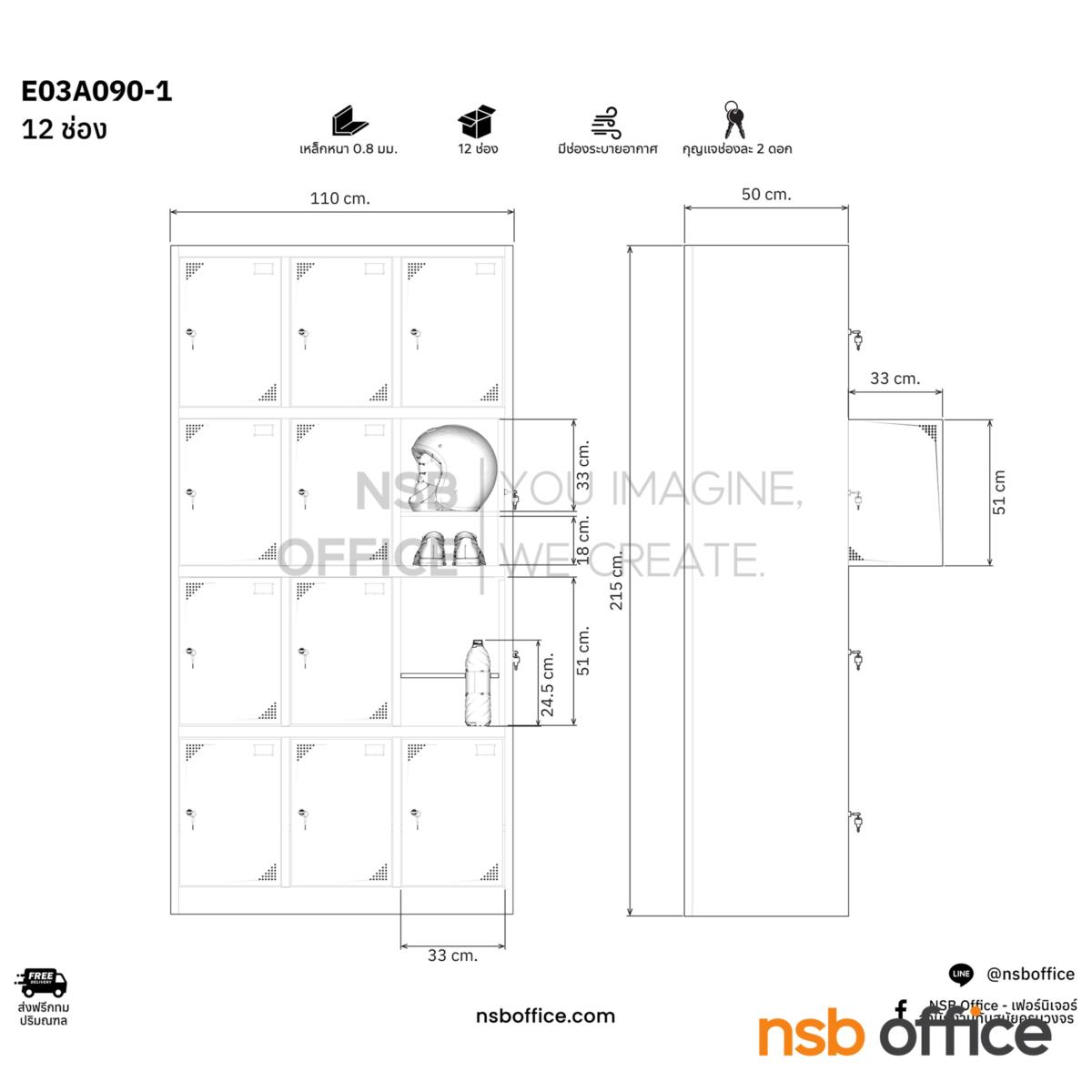 E03A090: ตู้ล็อกเกอร์เหล็ก 12 ประตู ด้านบนสามารถวางหมวกกันน็อคได้ ด้านล่างวางรองเท้าเซฟตี้ ด้านหน้าวางน้ำดื่ม รุ่น Daisy (เดซี่) ขนาด 110W*50D*215H cm.