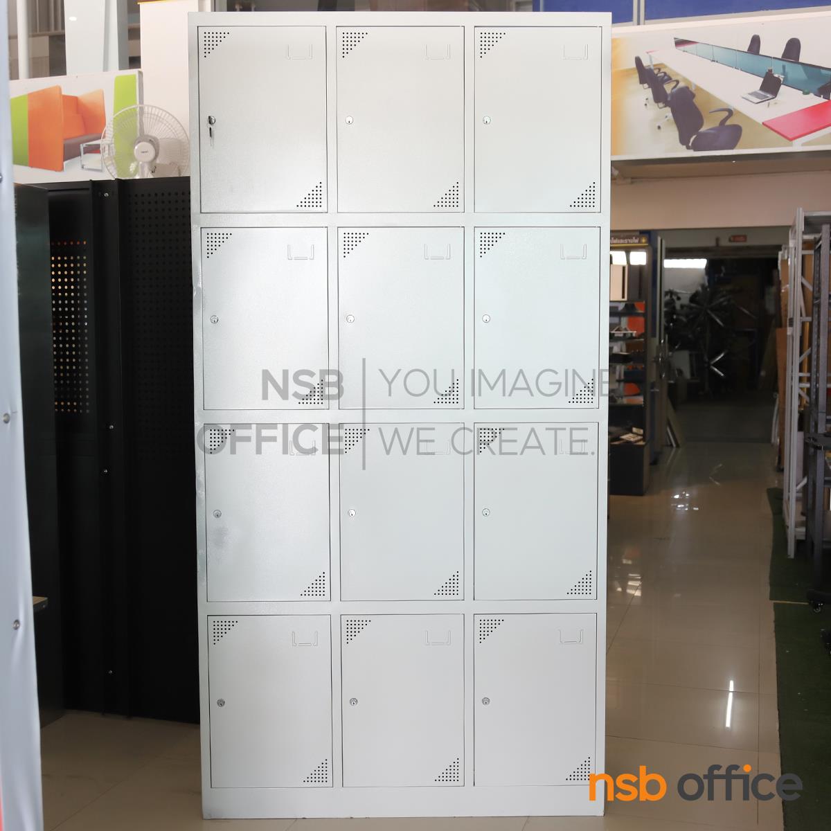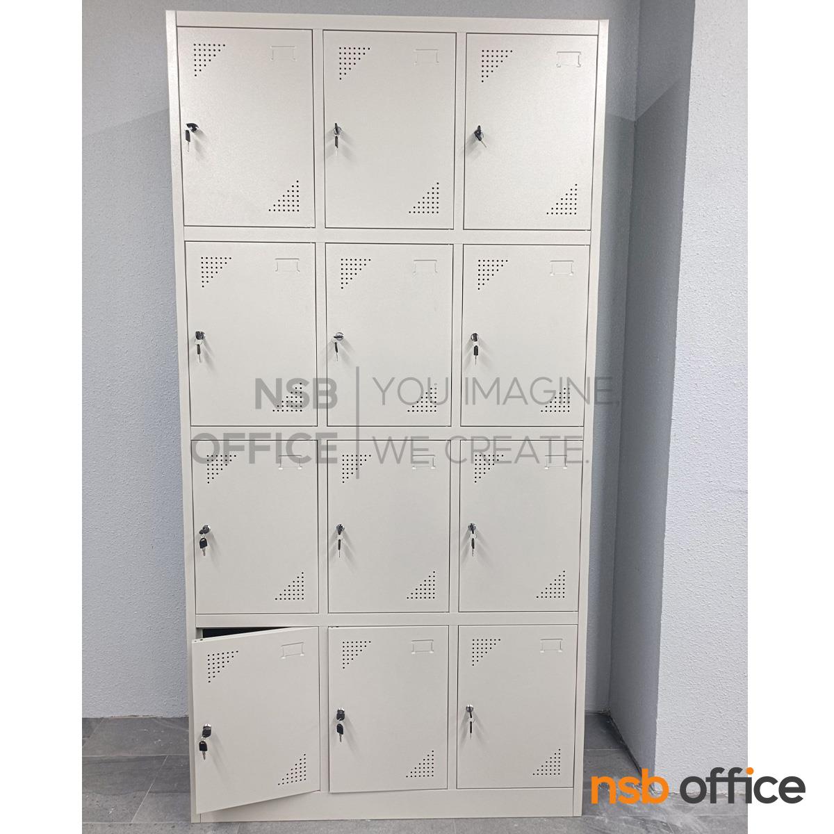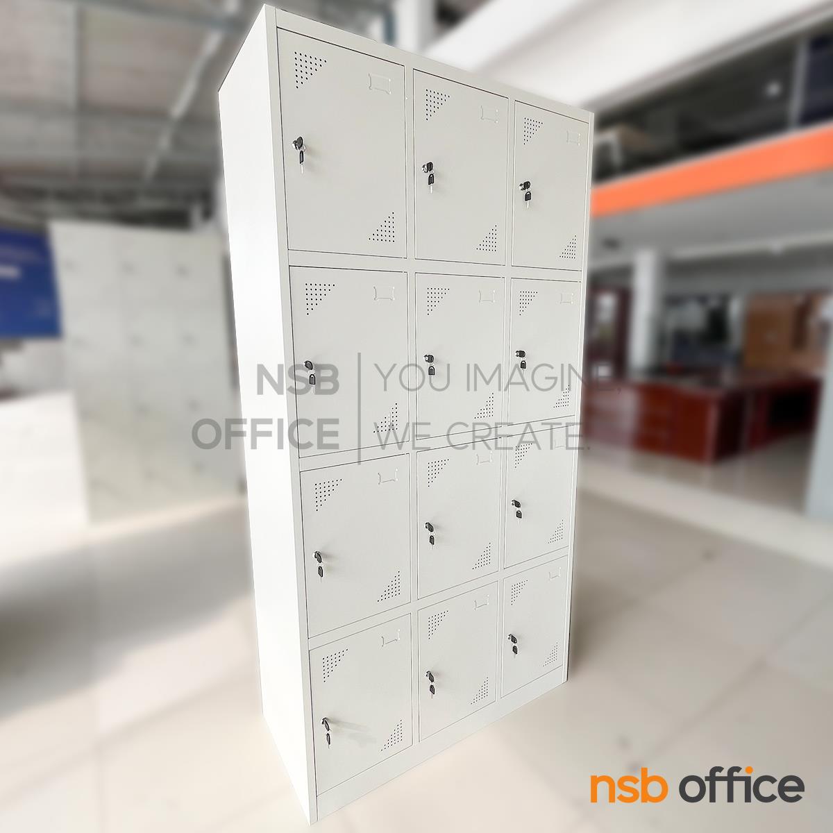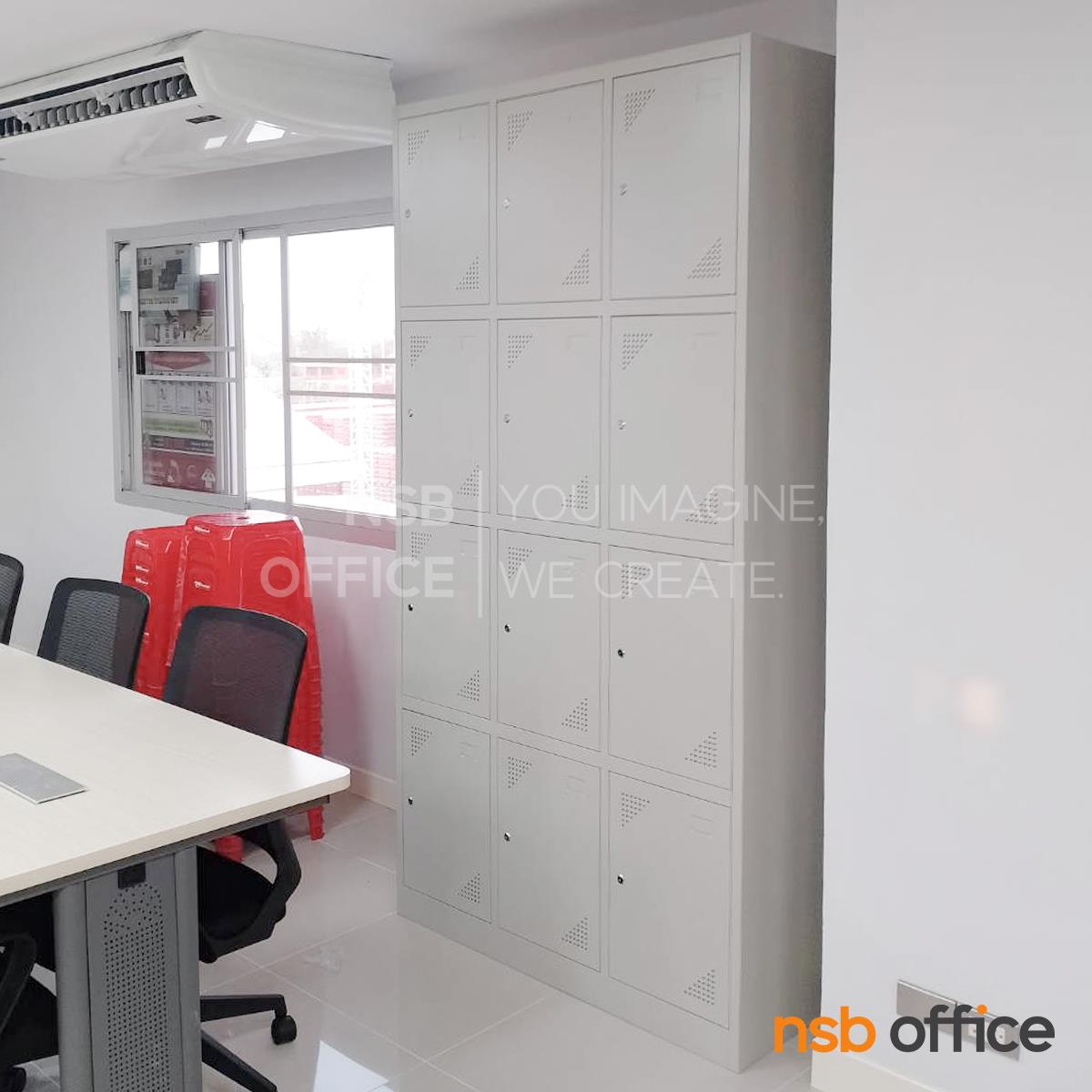 E03A090: ตู้ล็อกเกอร์เหล็ก 12 ประตู ด้านบนสามารถวางหมวกกันน็อคได้ ด้านล่างวางรองเท้าเซฟตี้ ด้านหน้าวางน้ำดื่ม รุ่น Daisy (เดซี่) ขนาด 110W*50D*215H cm.