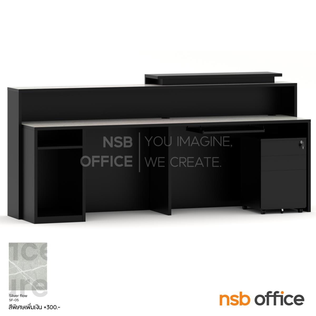 : เคาน์เตอร์ต้อนรับ Reception รุ่น Bubble Gum (บับเบิ้ลกัม) ขนาด 240W cm. *ตู้เหล็ก + รางคีย์บอร์ดสีดำ* พร้อมเจาะรูร้อยสายไฟ A04A049