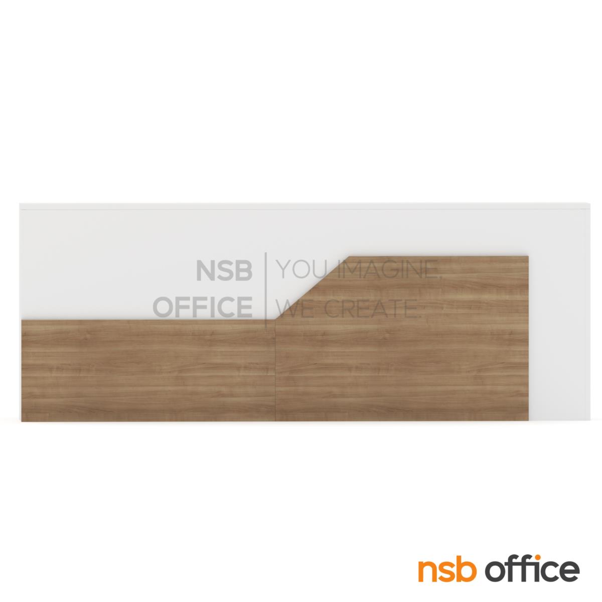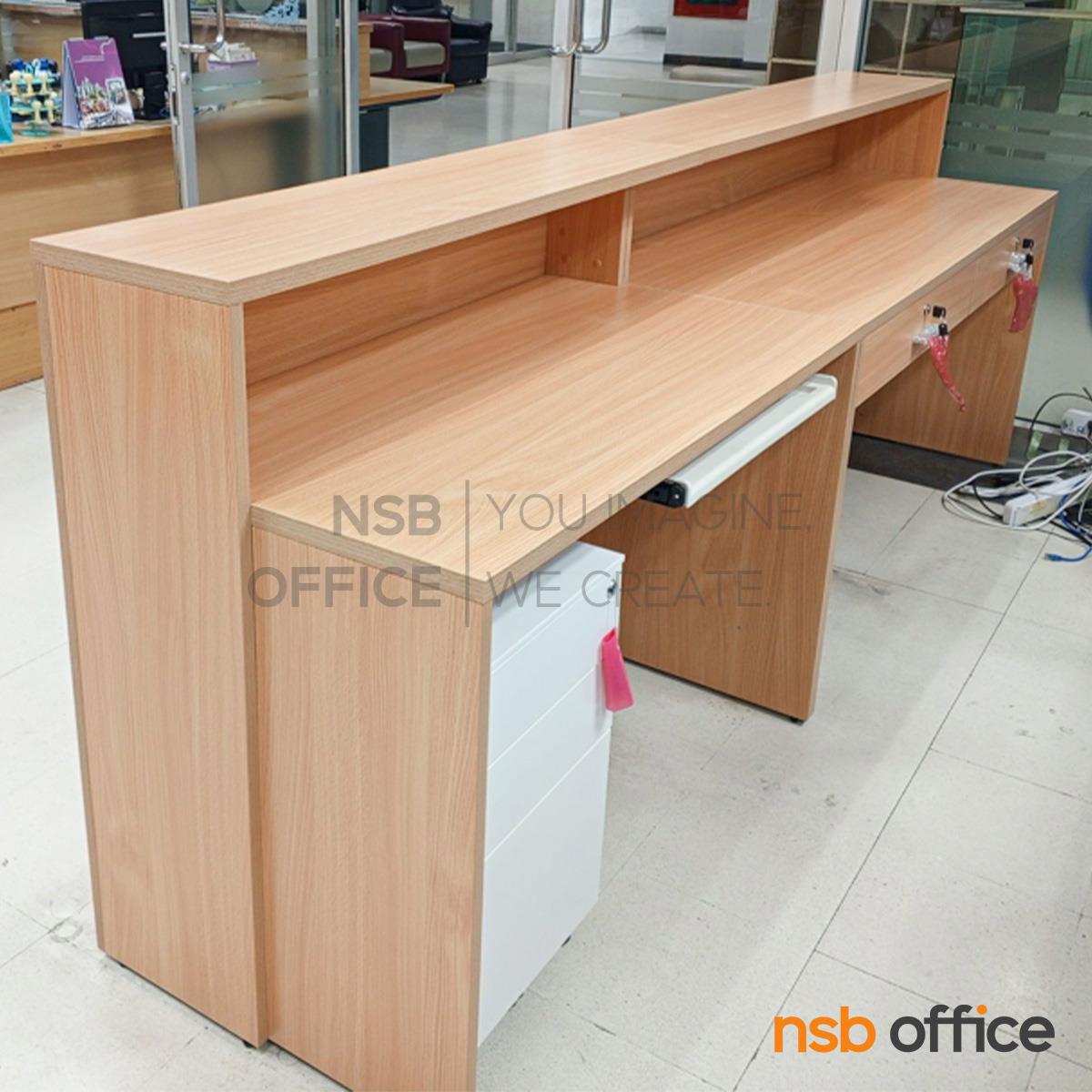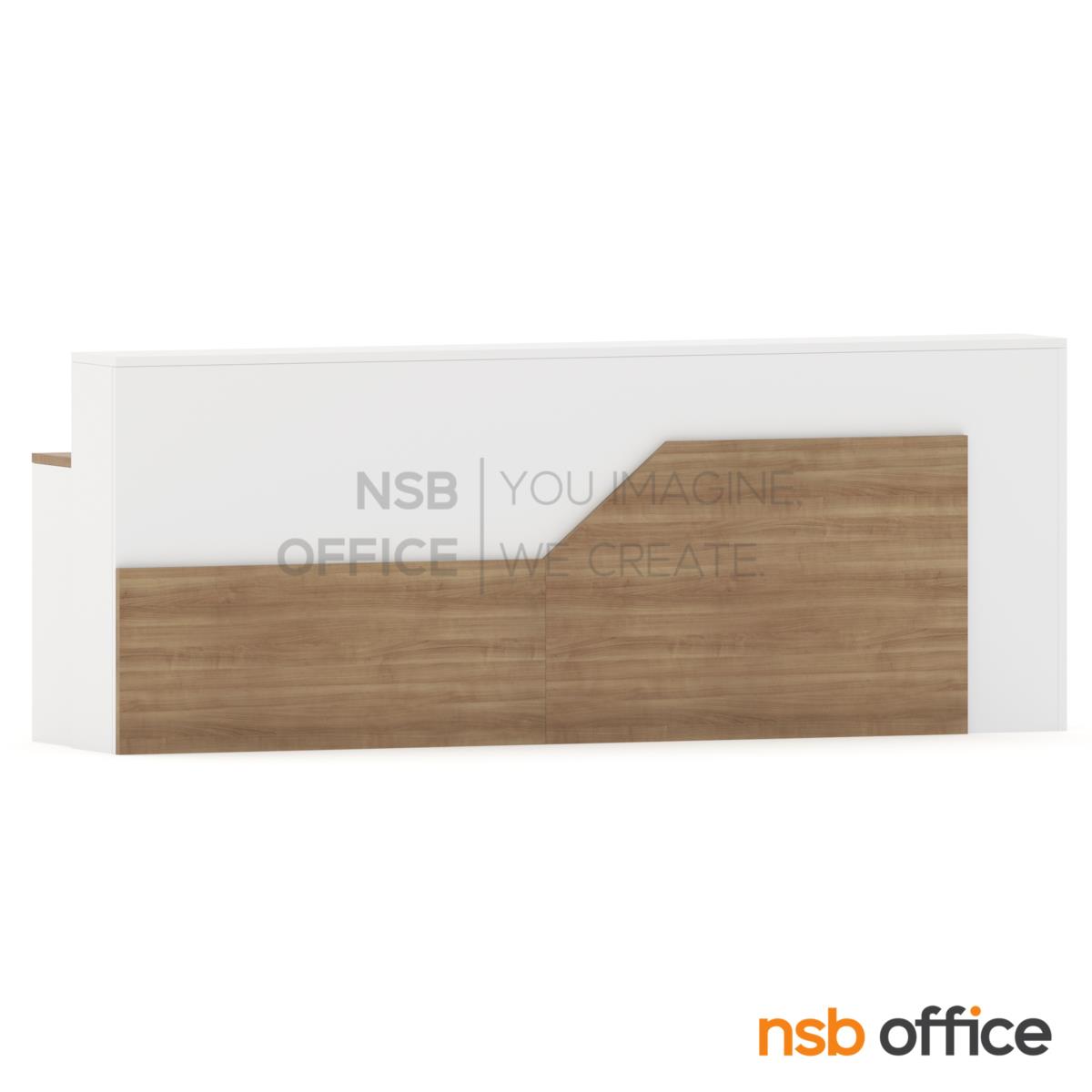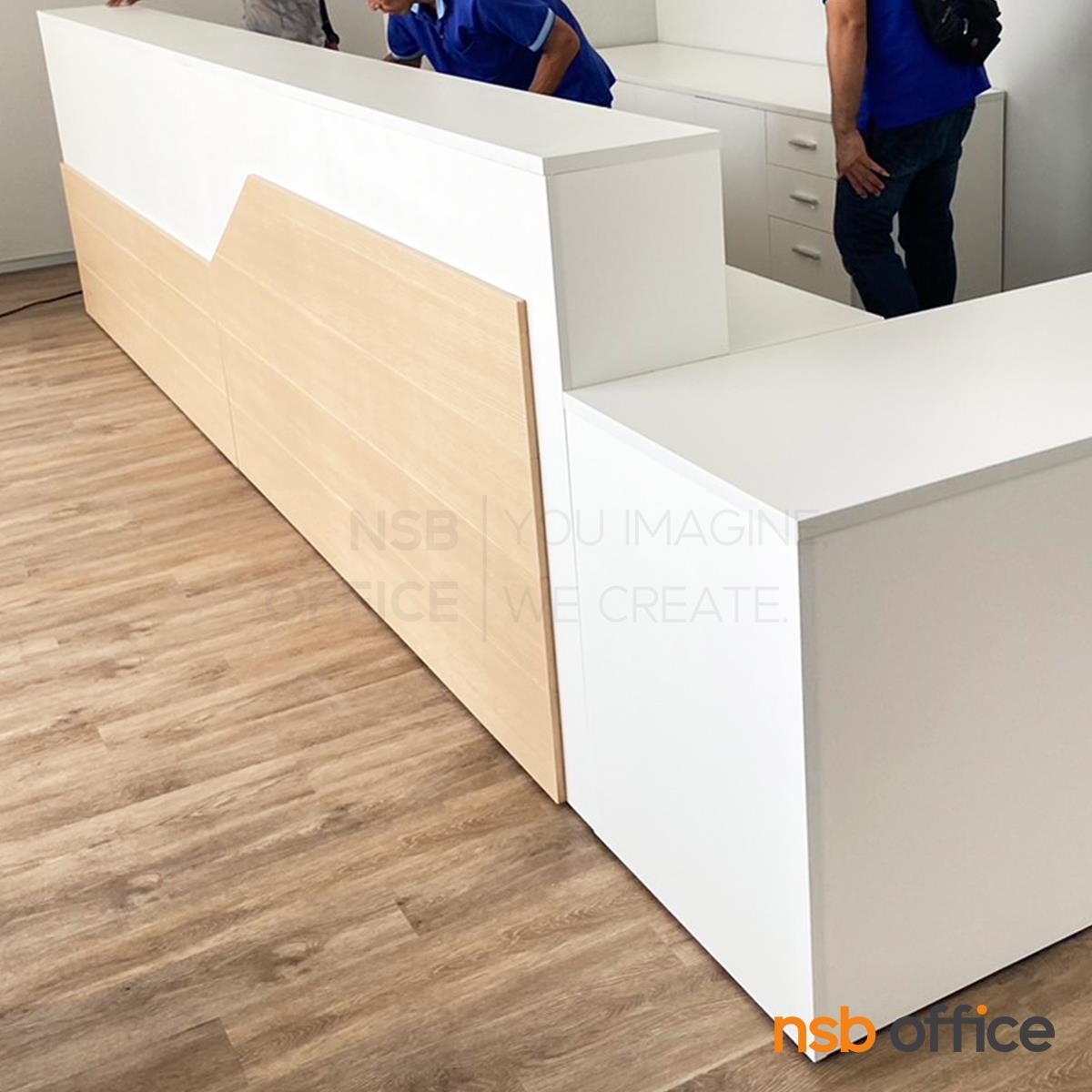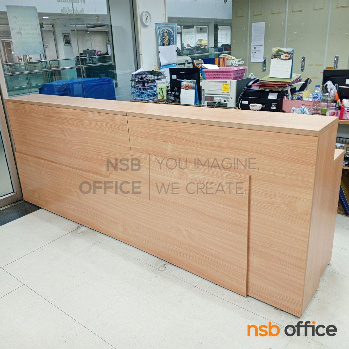 A11A111: เคาน์เตอร์ต้อนรับลูกค้า Reception Atlantis (แอตแลนติส) ขนาด 270W cm. (ด้านใน 2 ลิ้นชัก 1 ลิ้นชักล้อเลื่อน 1 รางคีย์บอร์ด)