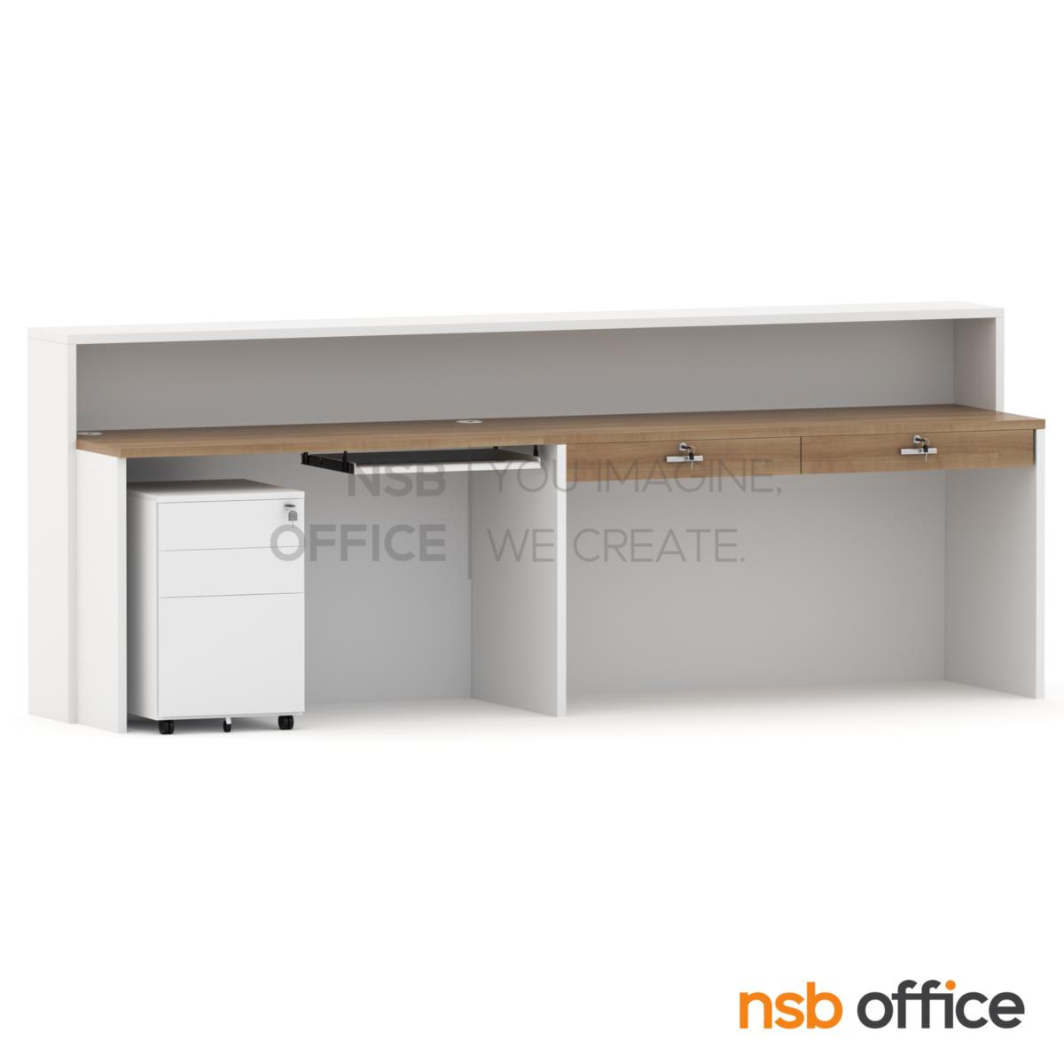 : เคาน์เตอร์ต้อนรับลูกค้า Reception Atlantis (แอตแลนติส) ขนาด 270 cm. (ด้านใน 5 ลิ้นชักล้อเลื่อน 1 รางคีย์บอร์ด) *ตู้เหล็ก + รางคีย์บอร์ดสีขาว* พร้อมเจาะรูร้อยสายไฟ A04A049