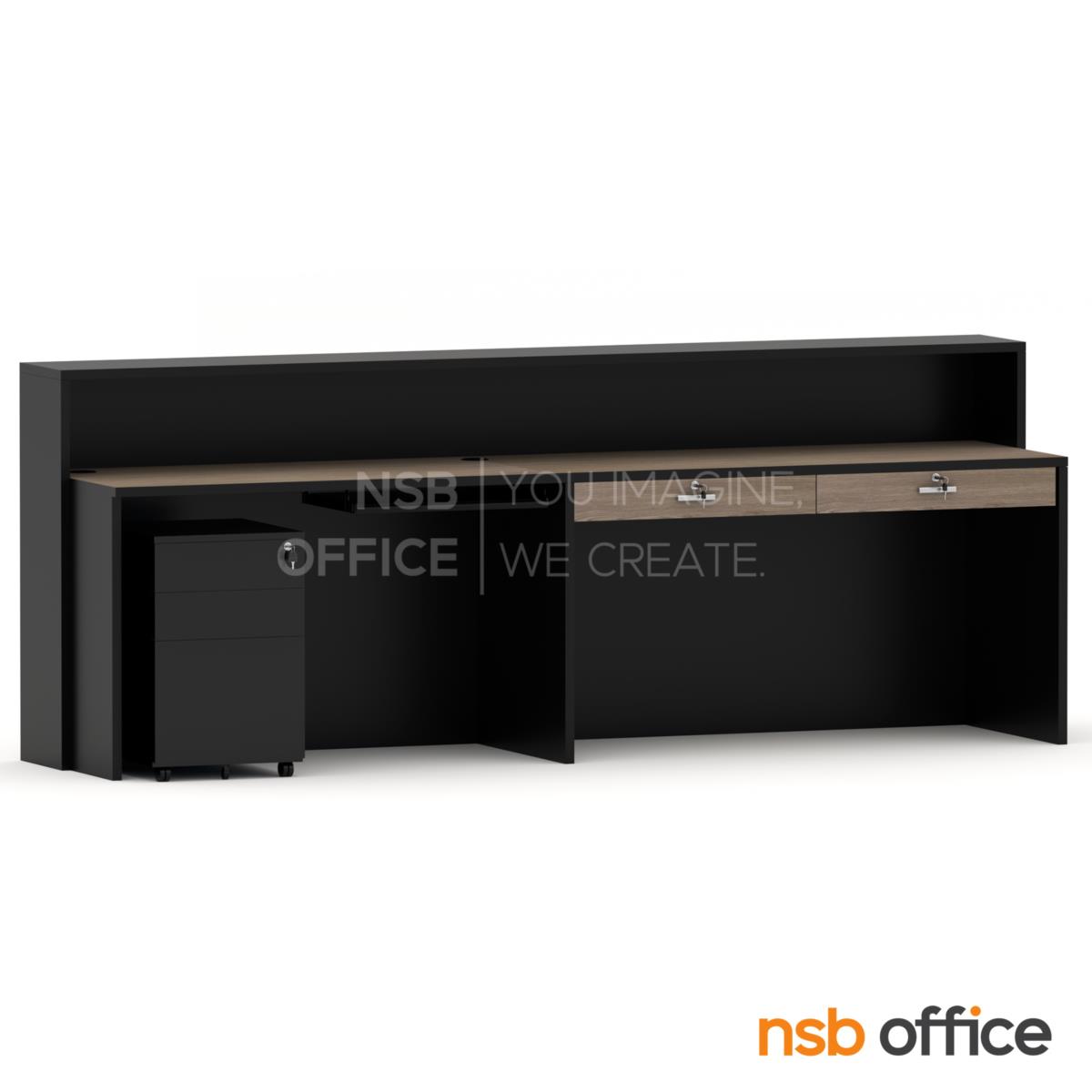 : เคาน์เตอร์ต้อนรับลูกค้า Reception Atlantis (แอตแลนติส) ขนาด 270 cm. (ด้านใน 5 ลิ้นชักล้อเลื่อน 1 รางคีย์บอร์ด) *ตู้เหล็ก + รางคีย์บอร์ดสีดำ* พร้อมเจาะรูร้อยสายไฟ A04A049