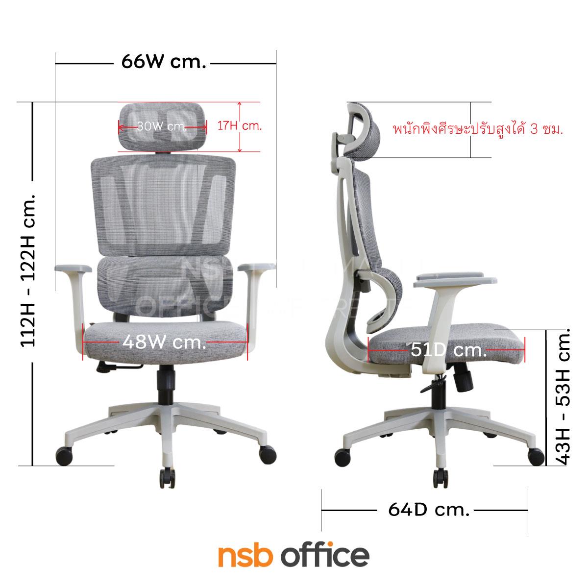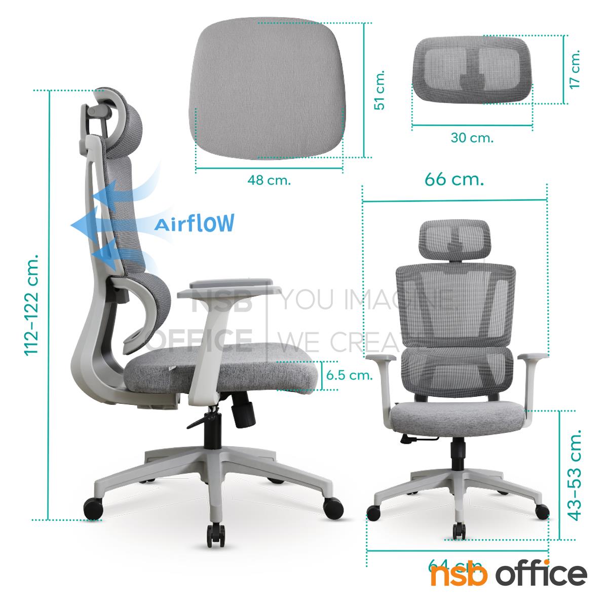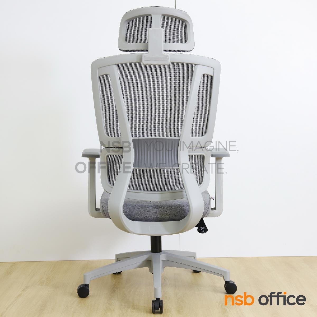 พนักพิงผลิตจากผ้าตาข่าย (Mesh) คุณสมบัติระบายอากาศได้ดี ลดความร้อนสะสมขณะใช้งาน พร้อมโครงสร้างรองรับแผ่นหลังเพื่อความสบายและรองรับสรีระในการนั่งทำงานระยะยาว