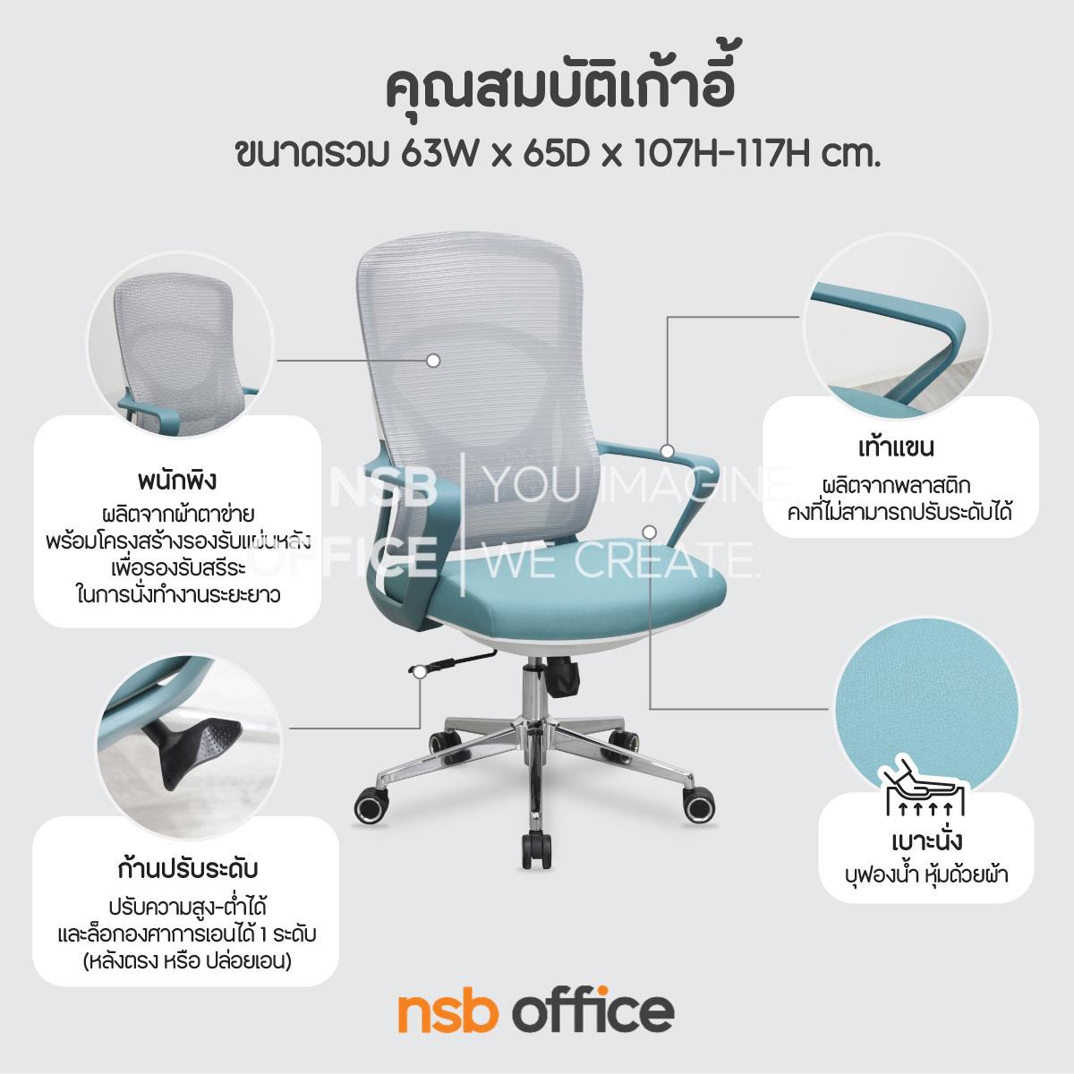 พนักพิงผลิตจากผ้าตาข่าย (Mesh) คุณสมบัติระบายอากาศได้ดี ลดความร้อนสะสมขณะใช้งาน พร้อมโครงสร้างรองรับแผ่นหลังเพื่อความสบายและรองรับสรีระในการนั่งทำงานระยะยาว