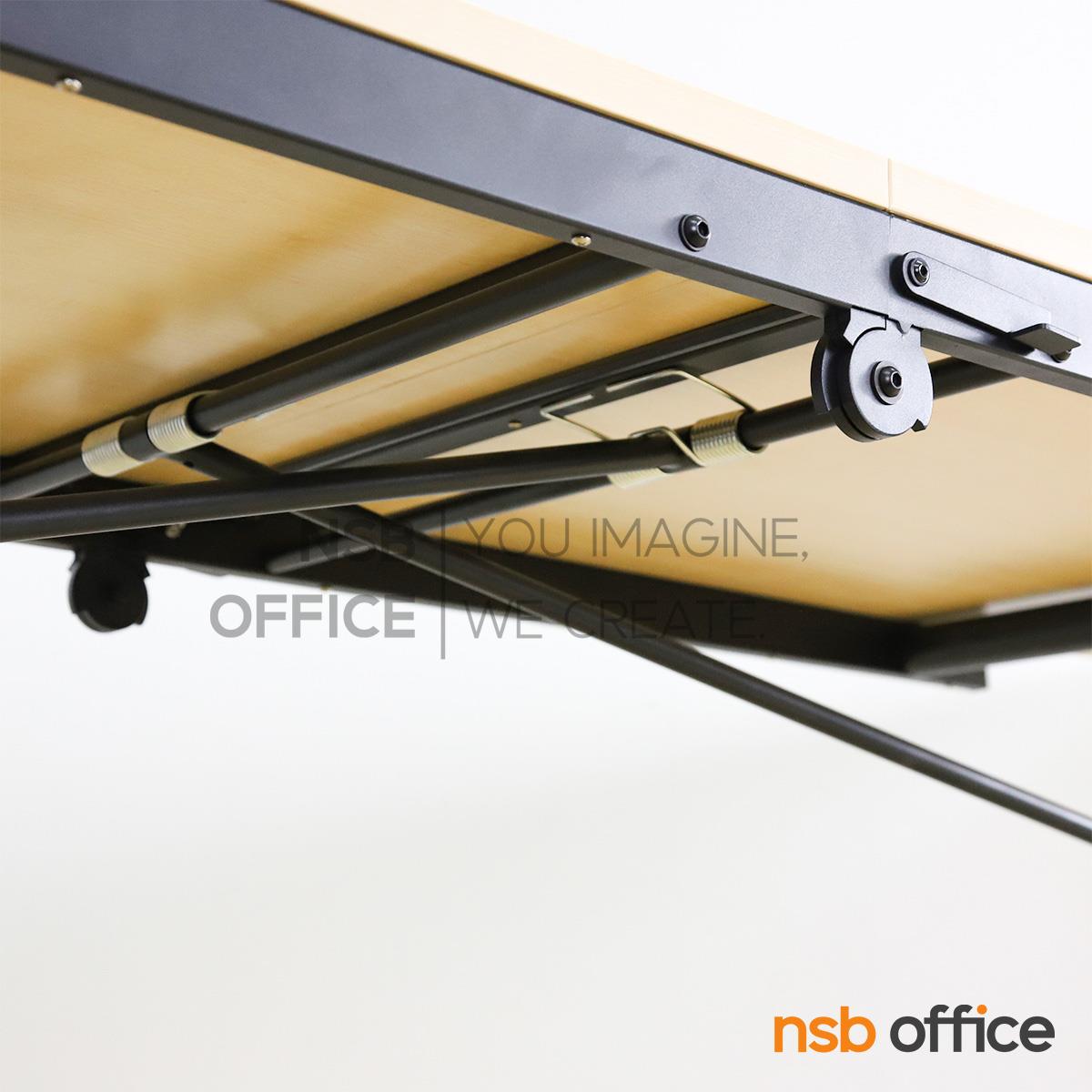 หน้าท็อปโต๊ะสามารถพับเก็บได้ เรียงซ้อนเป็นแถวตรง ประหยัดพื้นที่ในการจัดเก็บ