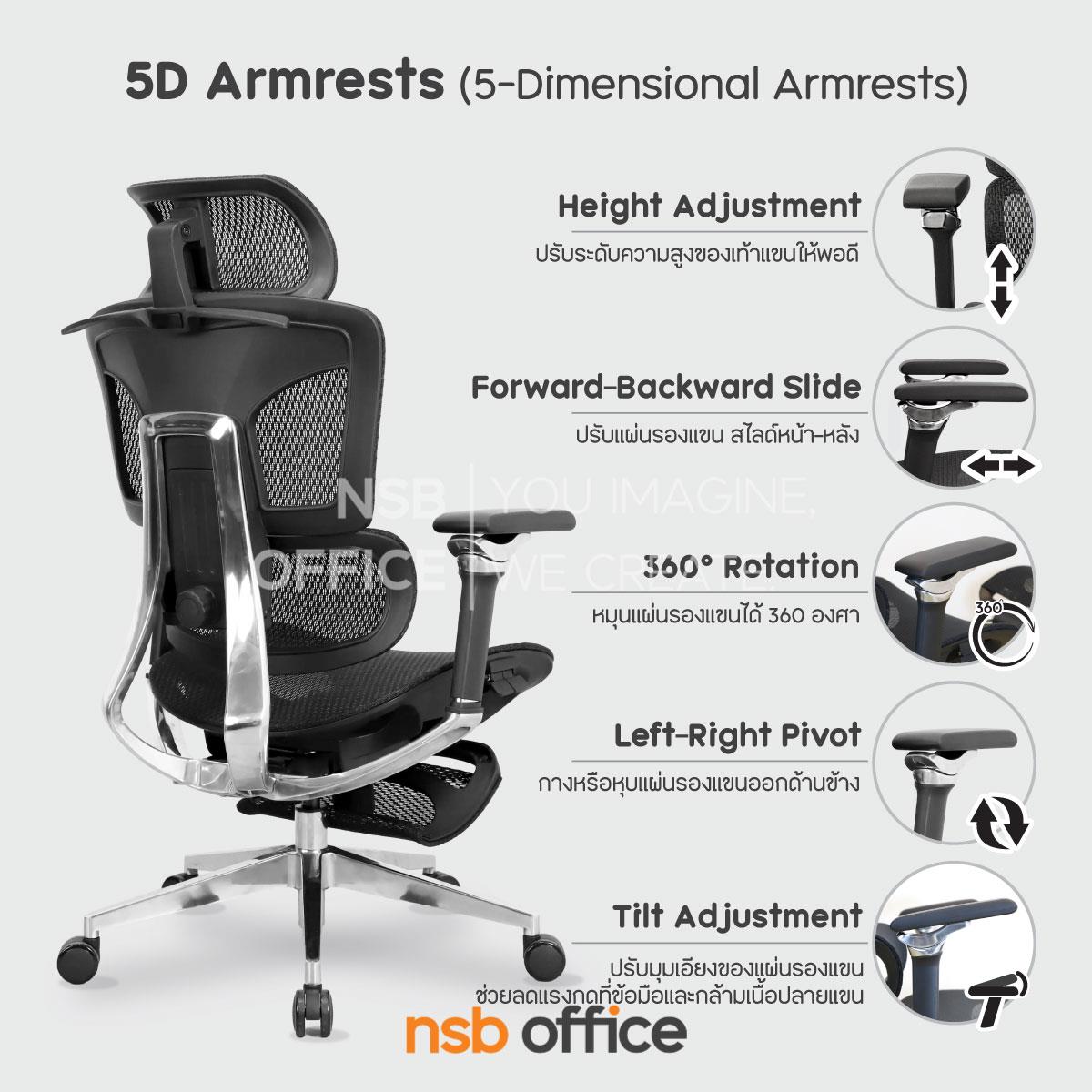 เท้าแขนปรับระดับแบบ 5D คือปรับระดับขึ้น-ลง , แผ่นยางสไลด์หน้า-หลัง และแผ่นยางปรับหมุนรอบตัว 360° , ข้อต่อหมุนซ้าย-ขวา และ ข้อต่อสามารถกระดกที่เท้าแขนขึ้น-ลงได้