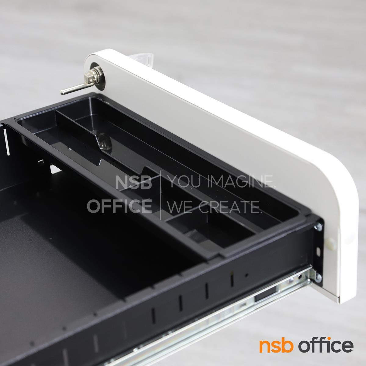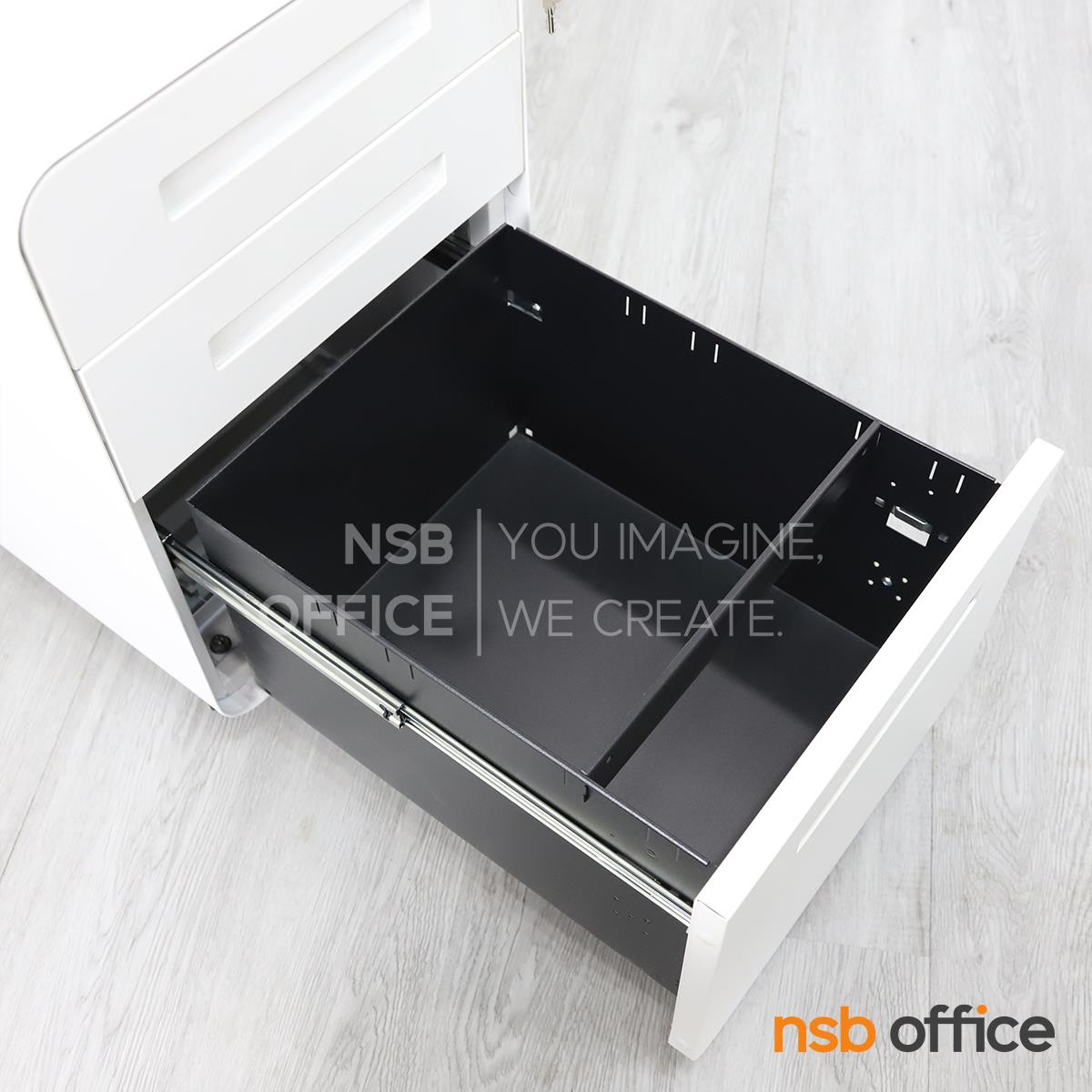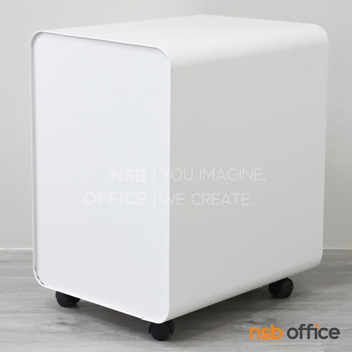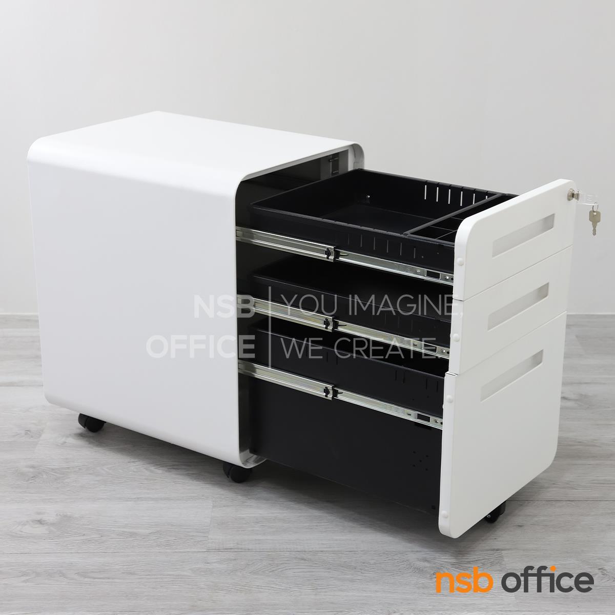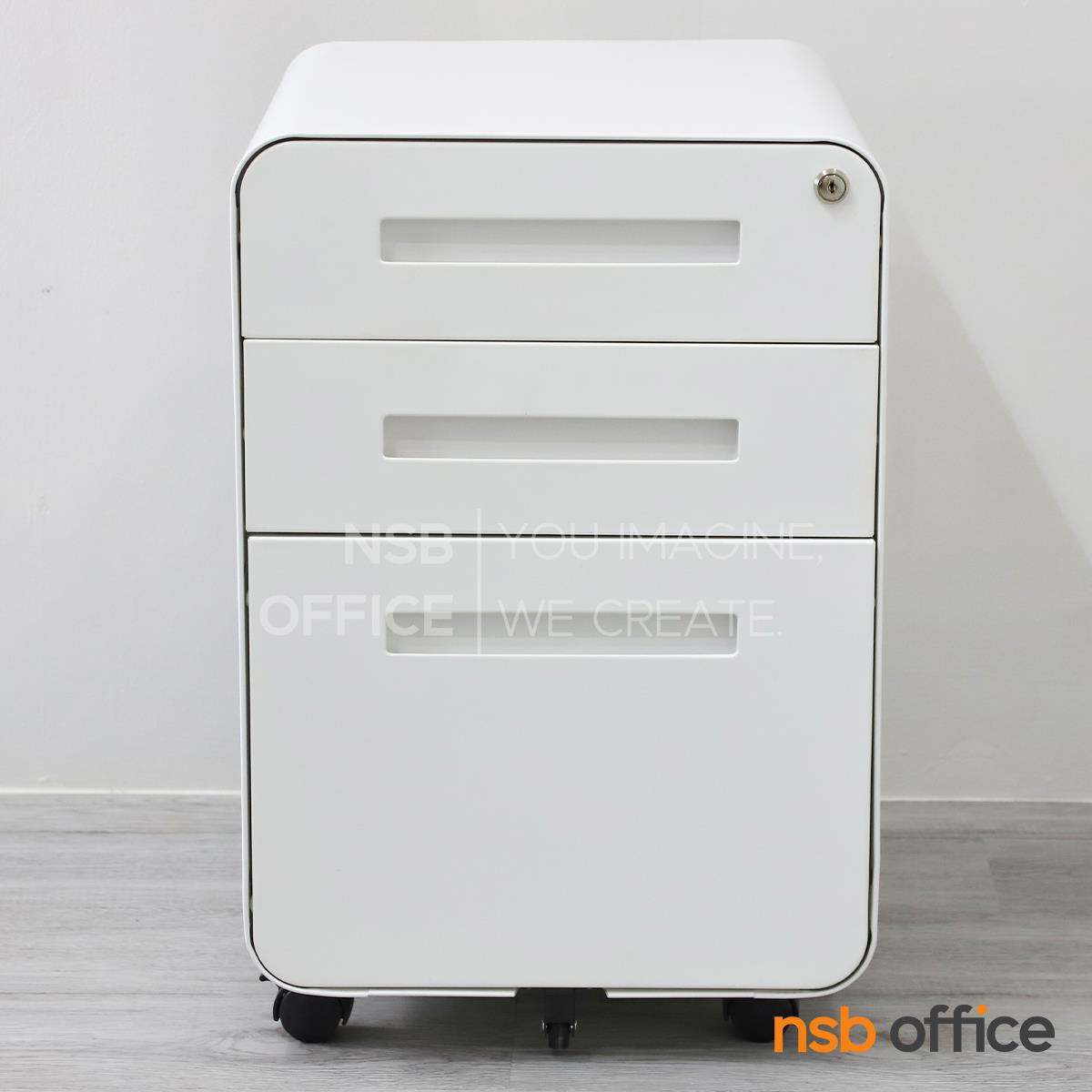 : ตู้เหล็ก 3 ลิ้นชักล้อเลื่อน รุ่น Fergus (เฟอร์กัส) สีขาวล้วน วางใต้โต๊ะ