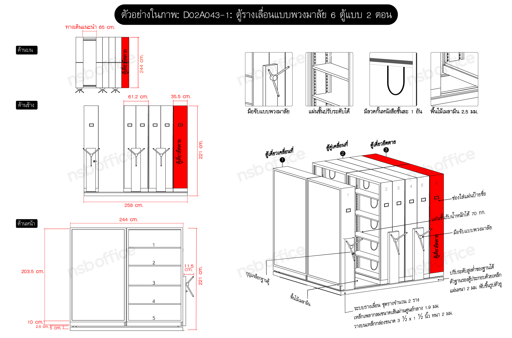 : 6 ตู้ 258W*244D*221H cm (ความจุ 900 แฟ้ม)