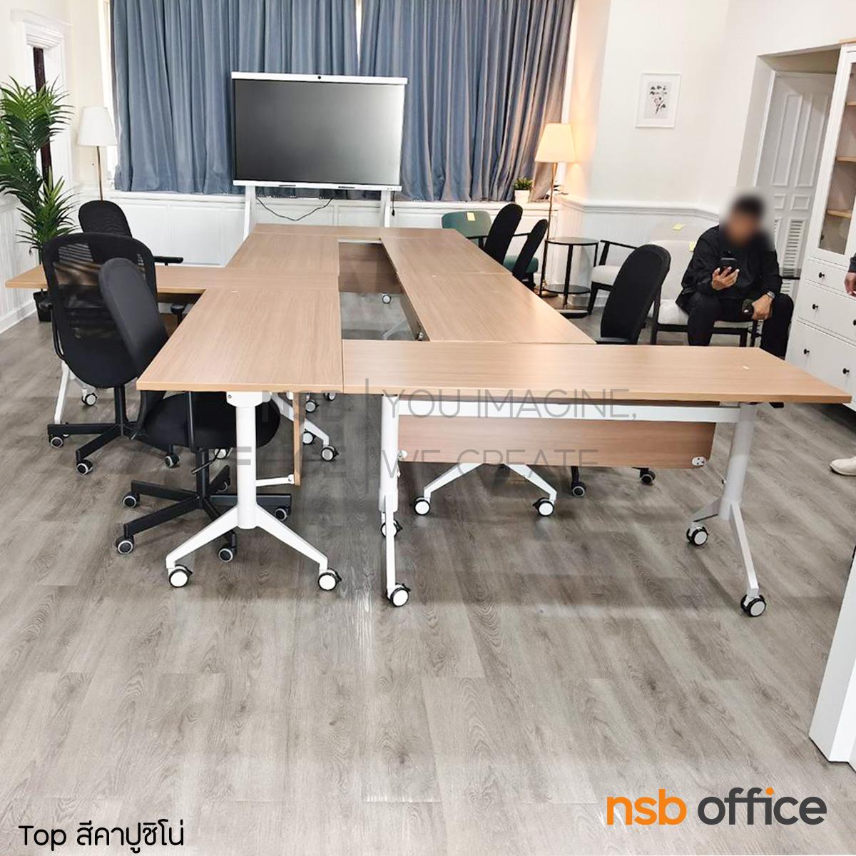 : โต๊ะประชุมพับเก็บได้ล้อเลื่อน รุ่น Fontina (ฟอนตินา) ขนาด 150W cm. โครงขาเหล็กสีขาว บังตาไม้ ล้อล็อกได้