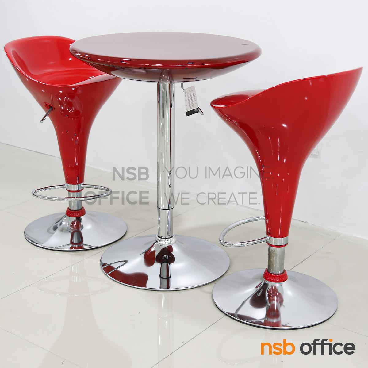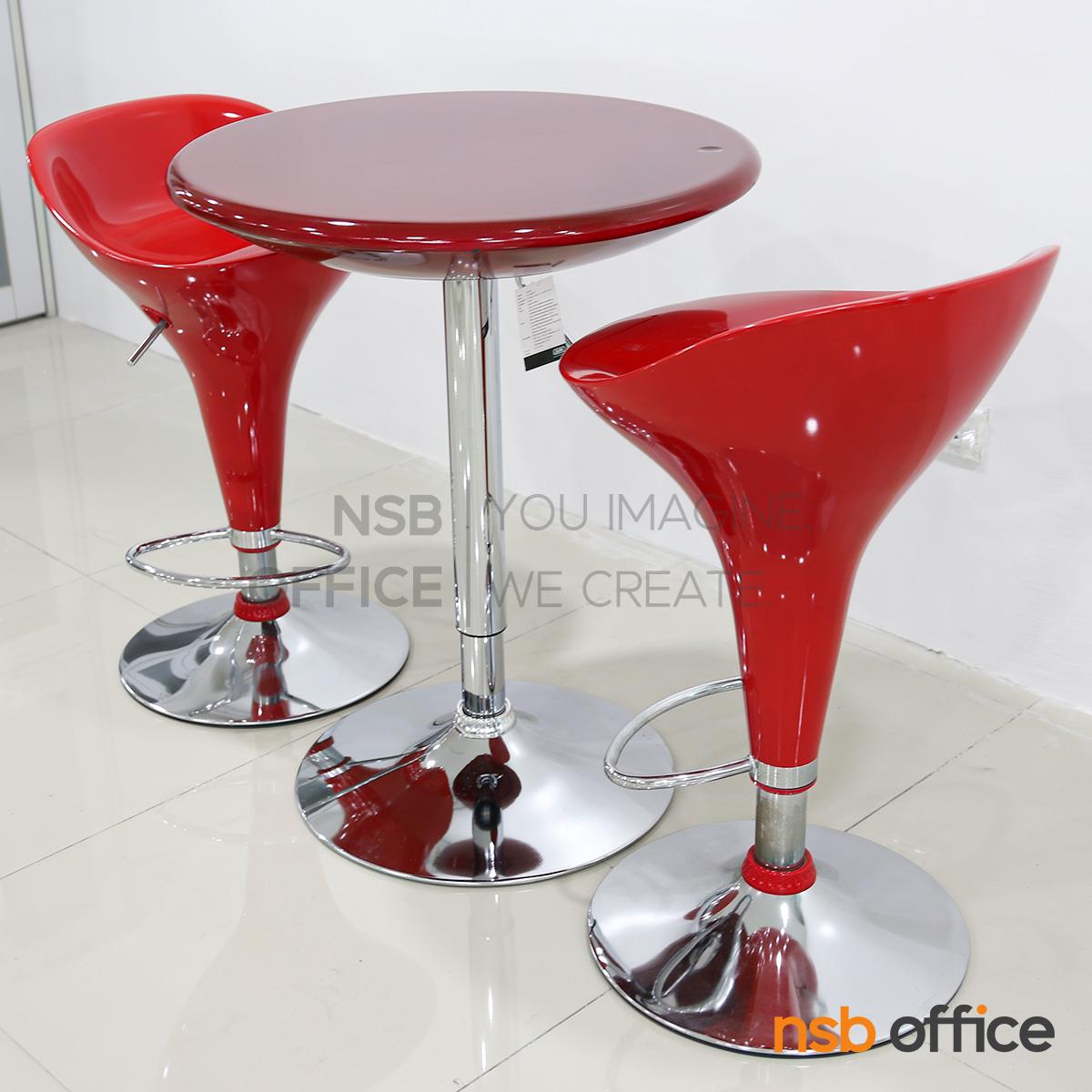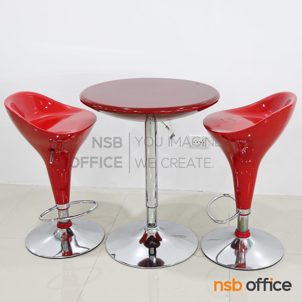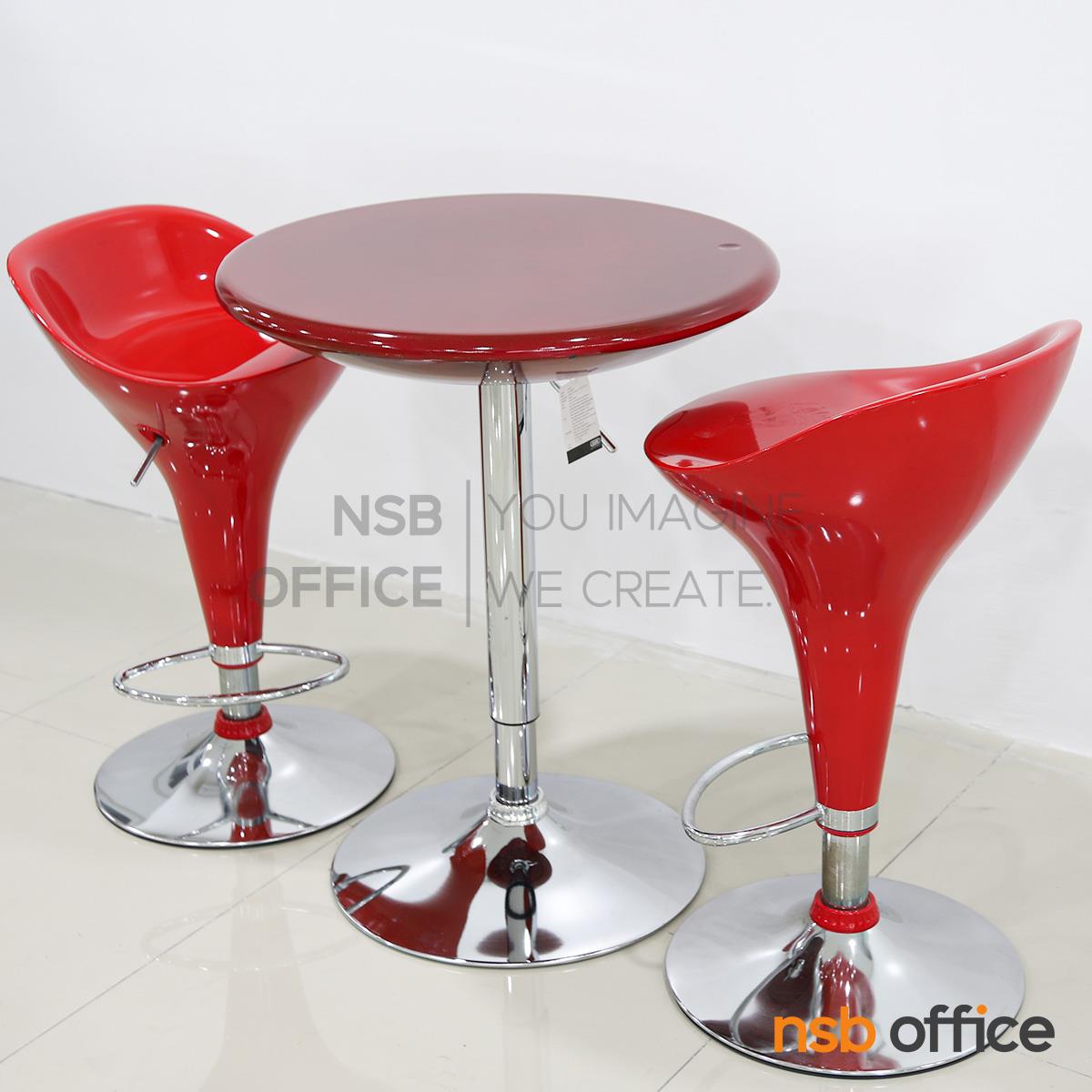 โต๊ะหน้าท็อปกลมสีแดง โครงขาเหล็กฐานจานกลม สามารถปรับระดับสูง-ต่ำได้