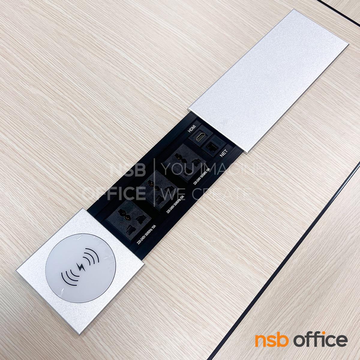 หน้าท็อปโต๊ะมีป๊อปอัพฝาสไลด์รองรับ Mobile wireless charger กำลังไฟสูงสุด 10W ด้านล่างเป็น 3 Power , 1 HDMI 2.0 , Lan (CAT 5E)