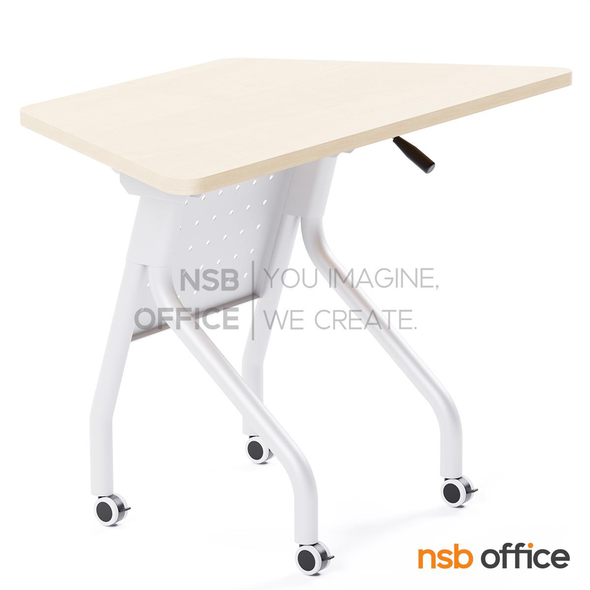 หน้าท็อปโต๊ะสามารถพับเก็บได้ เรียงซ้อนเป็นแถวตรง ประหยัดพื้นที่ในการจัดเก็บ