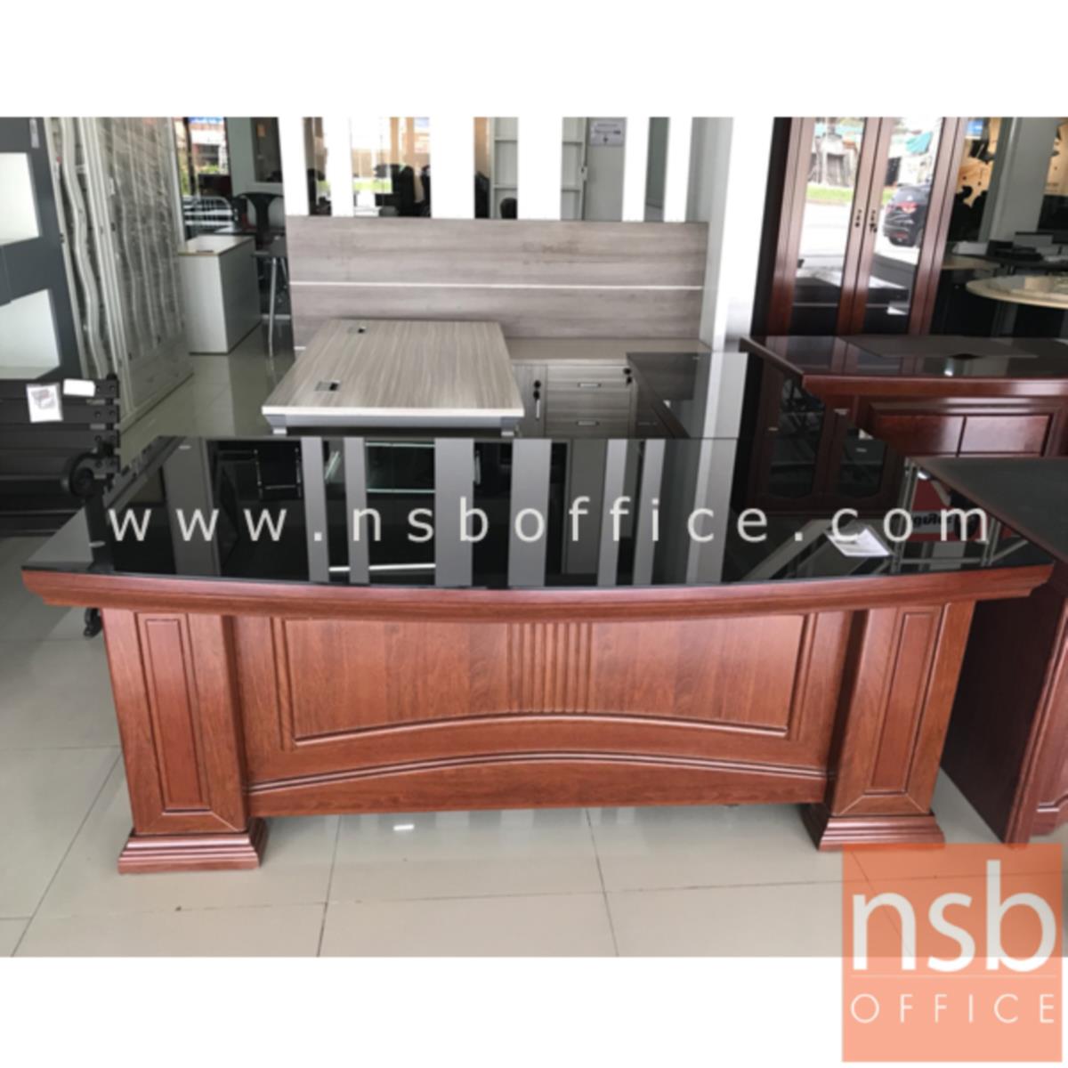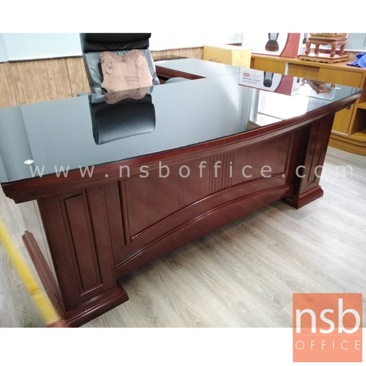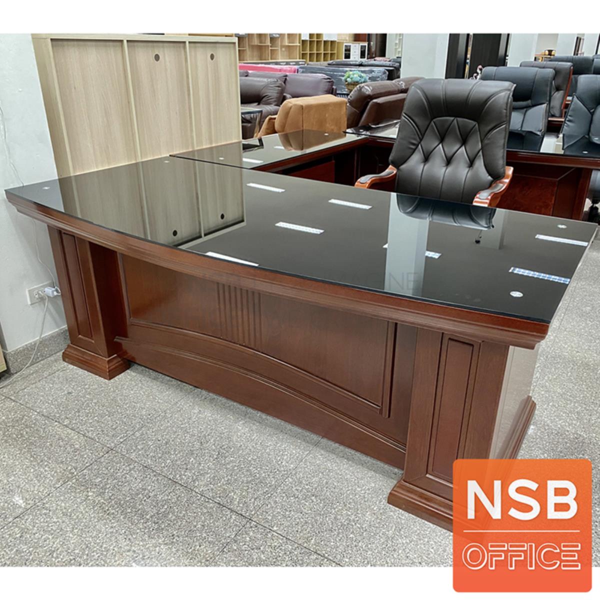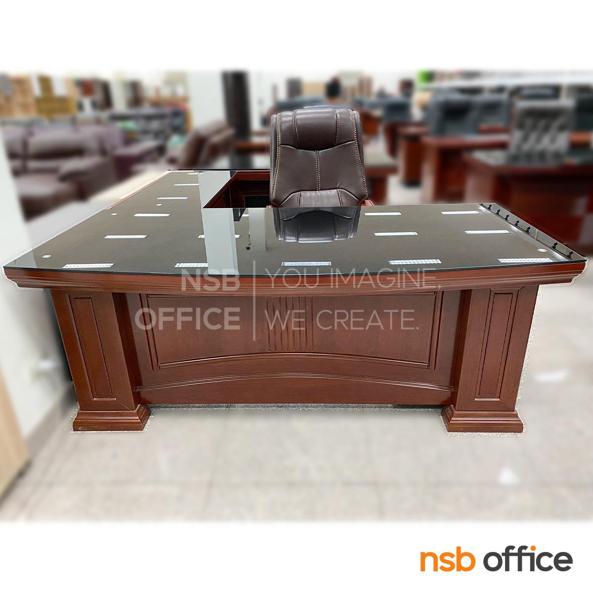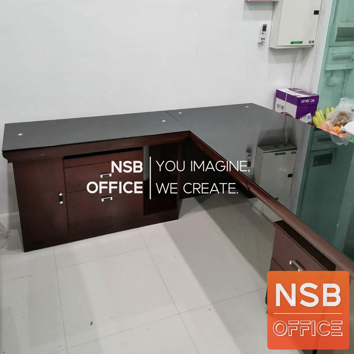 A06A046: โต๊ะผู้บริหารตัวแอลทับกระจก รุ่น Amour (อะมอ) ขนาด 200W cm. พร้อมตู้ลิ้นชักและตู้ข้าง
