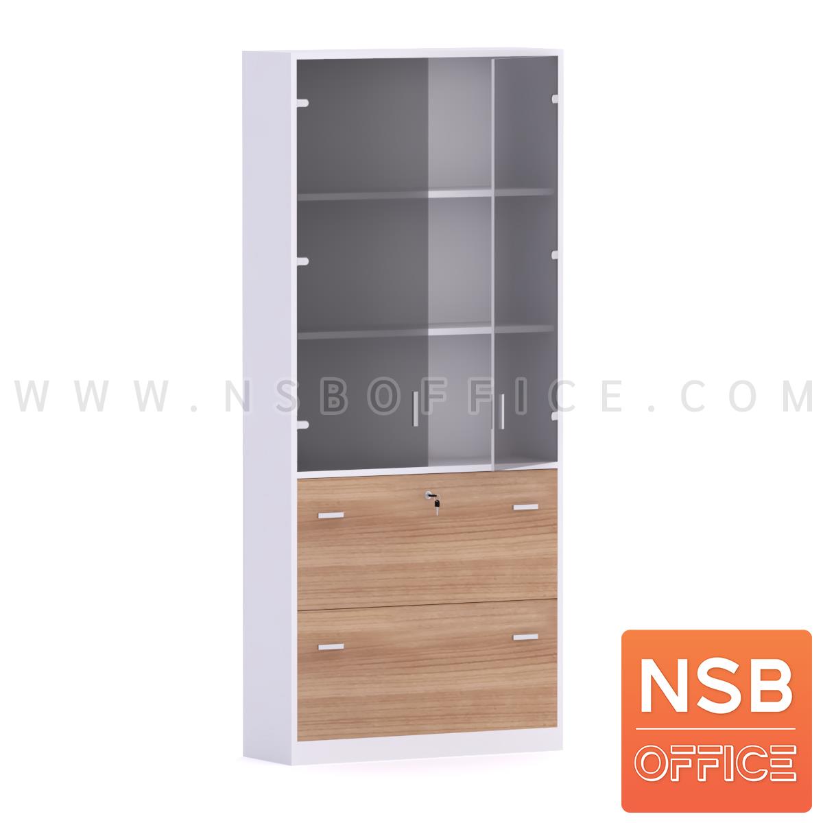 C03A029: ตู้เอกสาร 5 ชั้น สูง 200 cm. บนบานเปิดกระจก ล่างลิ้นชักใส่แฟ้มแขวน รุ่น Kelton (เคลตัน) เมลามีน