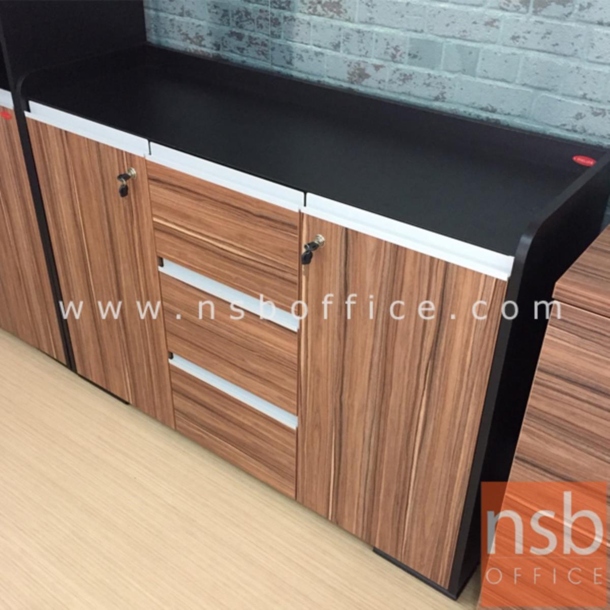 มี 2 บานเปิดข้าง พร้อม 3 ลิ้นชักกลาง พิเศษ TOP มีขอบกันของตก วางของได้สะดวกสบาย / TOP ปิดผิวเมลามีน กันร้อน กันชื้น / ผลิตสีวอลนัทตัดดำ