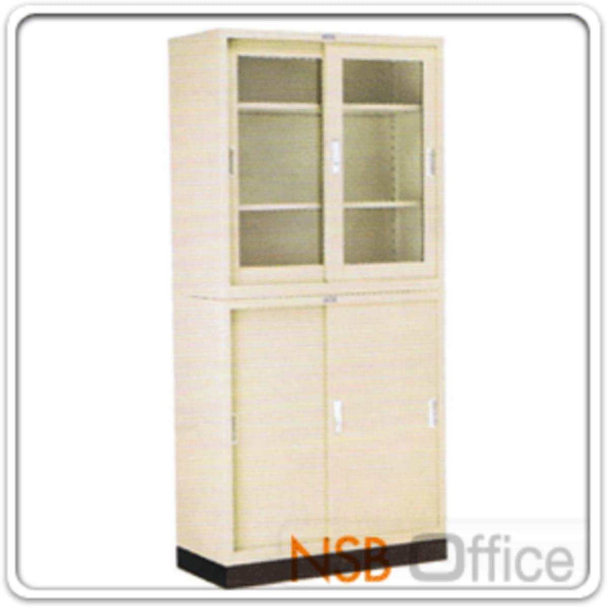 : ชุดตู้เก็บเอกสารเหล็ก 4 ฟุต บนบานเลื่อนกระจก ล่างบานเลื่อนทึบ พร้อมฐานรอง