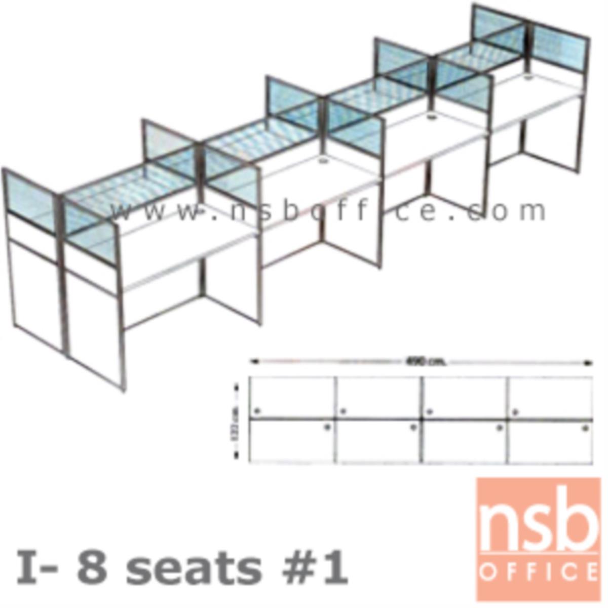 A04A093: ชุดโต๊ะทำงานกลุ่ม 8 ที่นั่ง ขนาดรวม 490W*122D cm. พร้อมพาร์ทิชั่นครึ่งกระจกขัดลาย