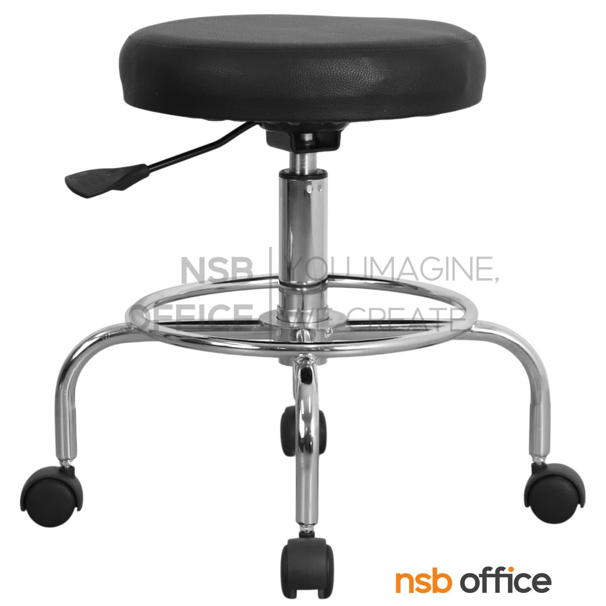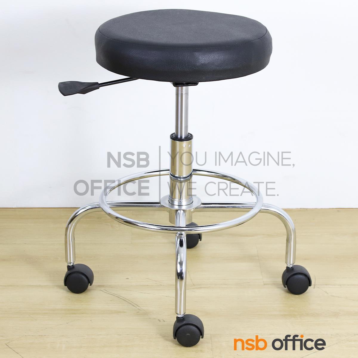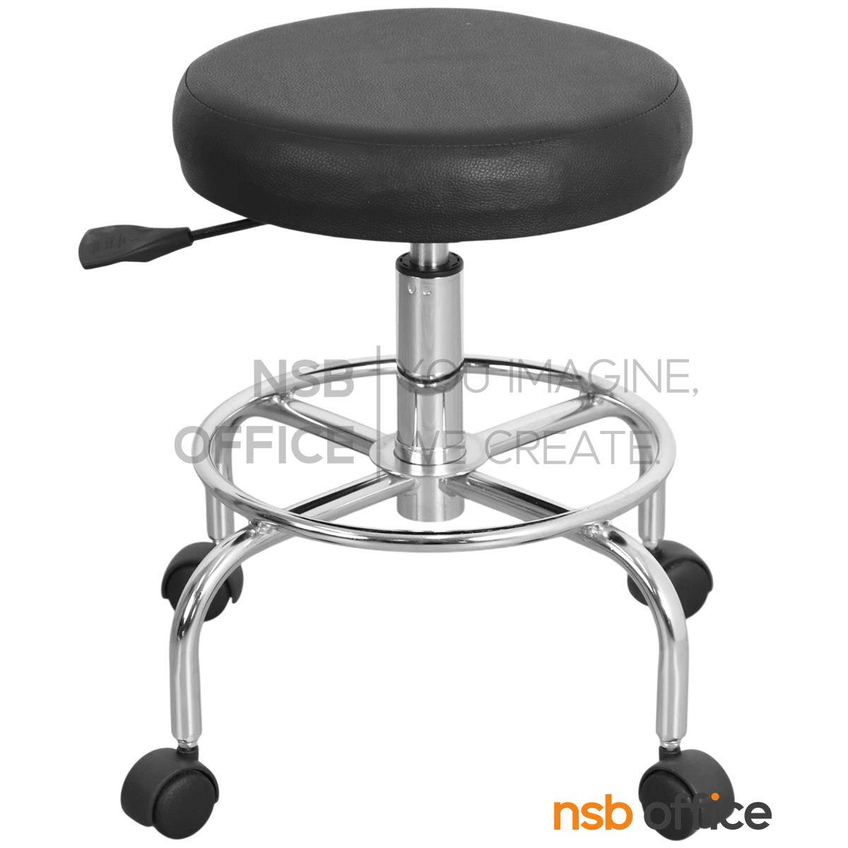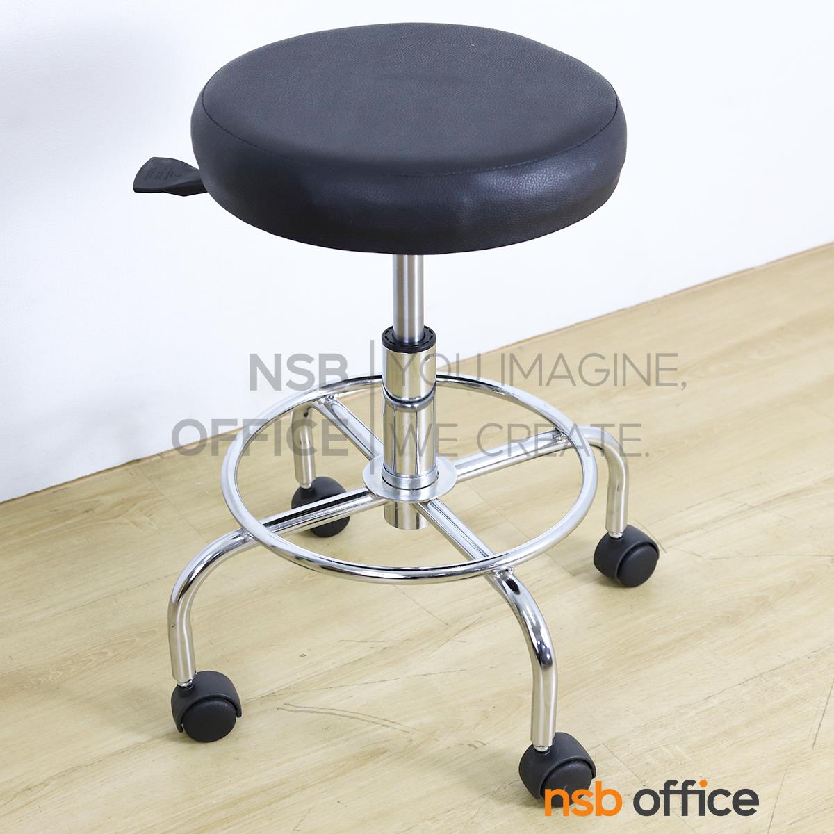 ปรับระดับสูงต่ำได้ ที่นั่งหมุนได้ มีพักเท้า ล้อเลื่อน 4 แฉก /ที่นั่งบุฟองน้ำหุ้มหนังเทียม สามารถเลือกสีได้