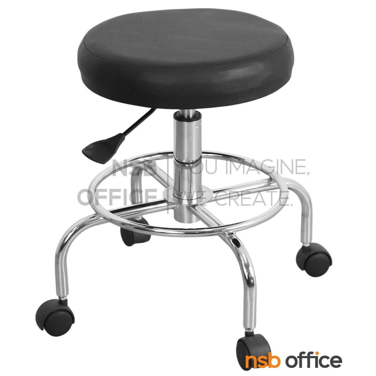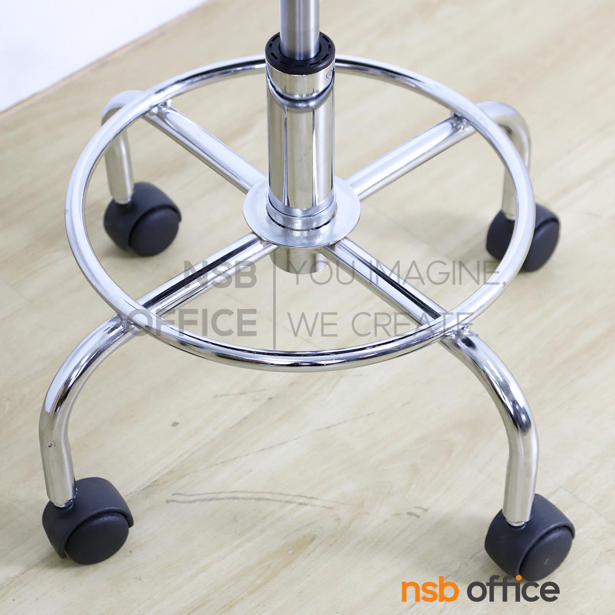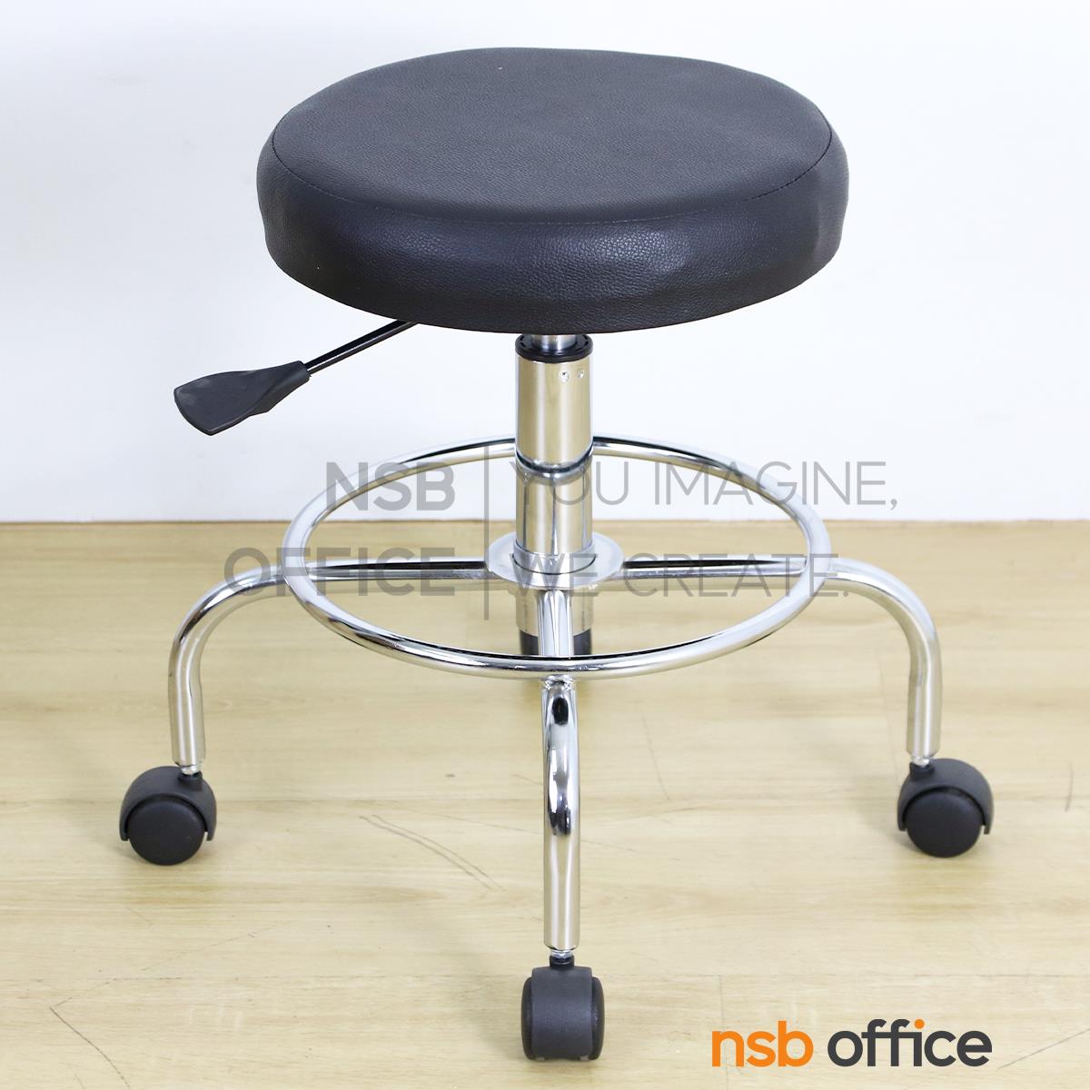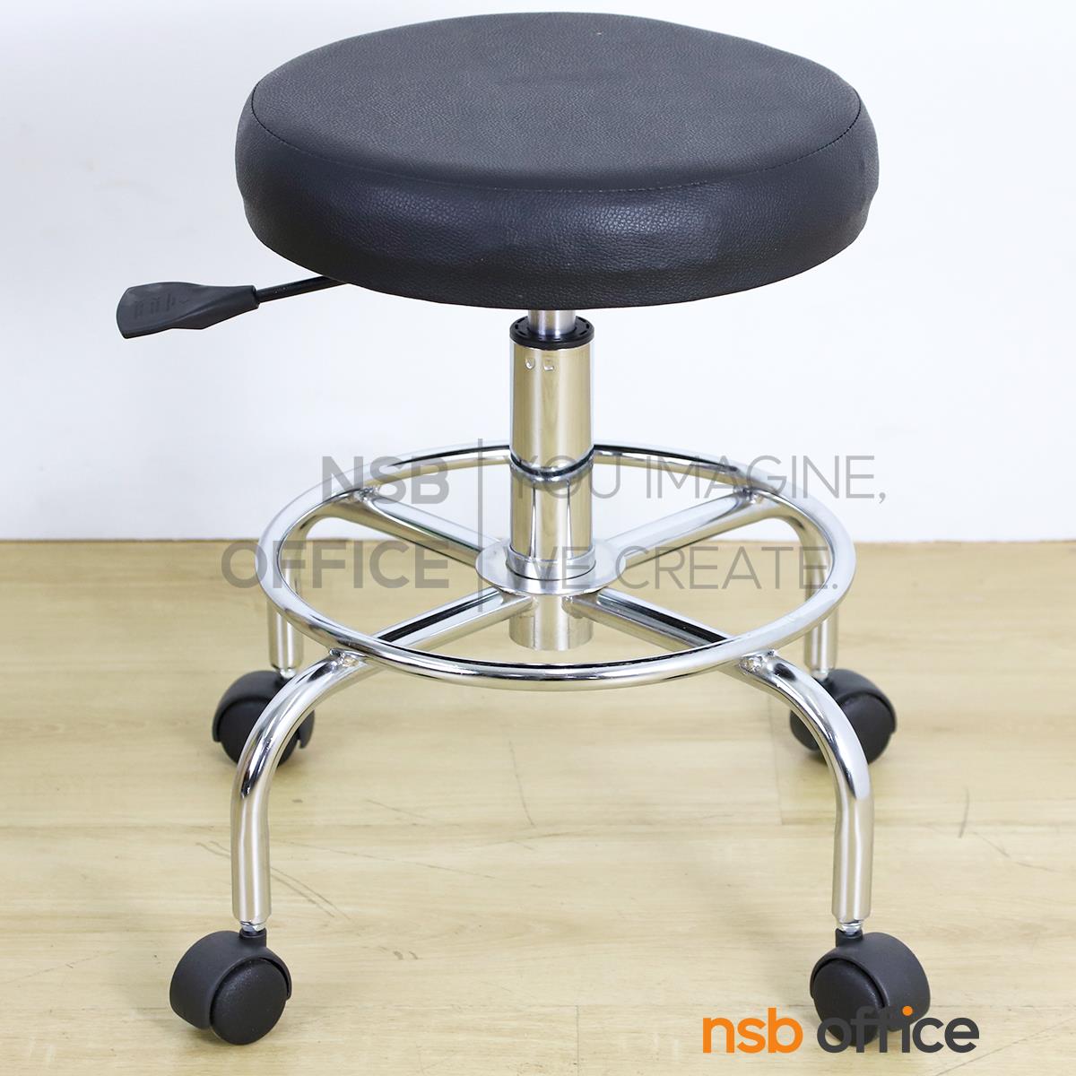 ปรับระดับสูงต่ำได้ ที่นั่งหมุนได้ มีพักเท้า ล้อเลื่อน 4 แฉก /ที่นั่งบุฟองน้ำหุ้มหนังเทียม สามารถเลือกสีได้