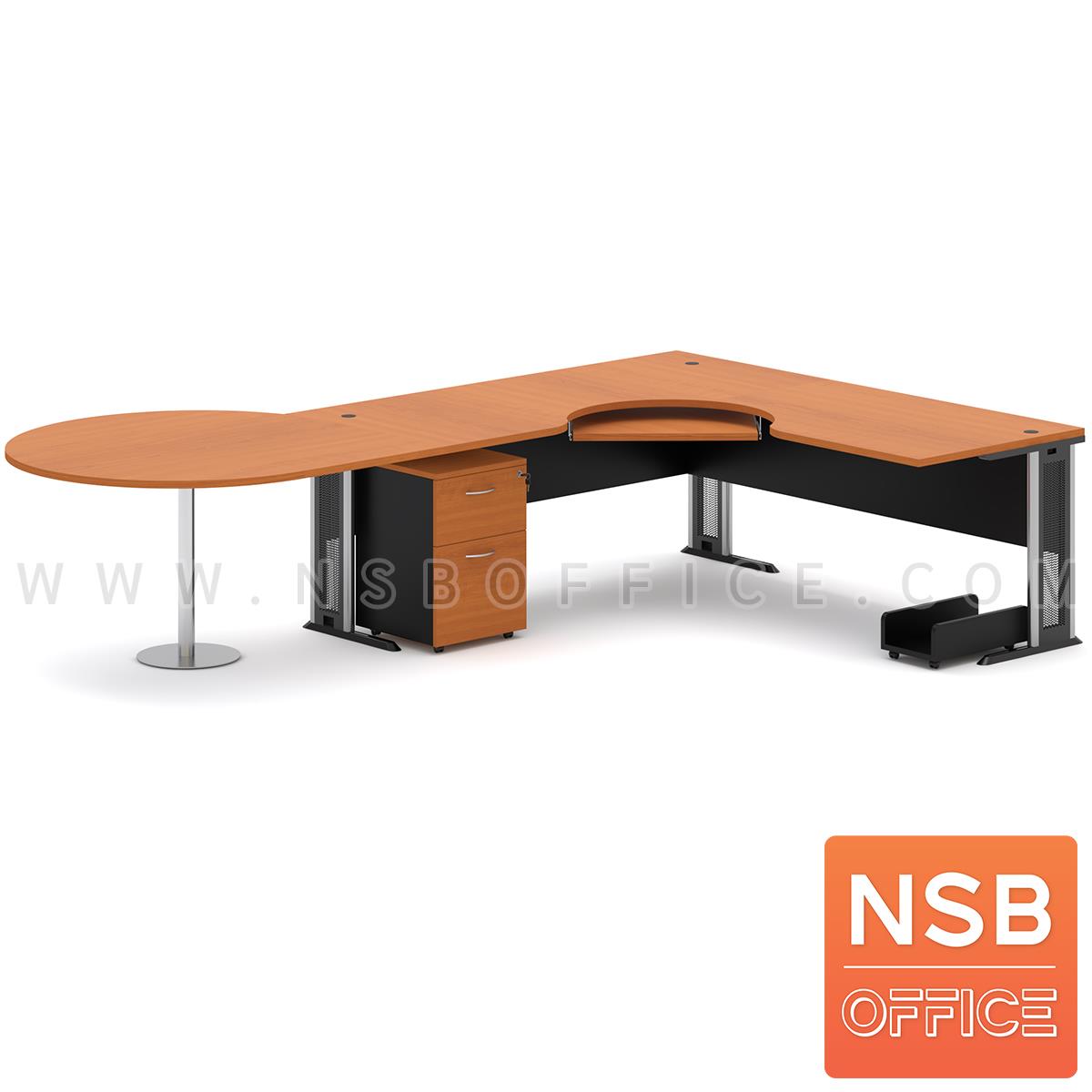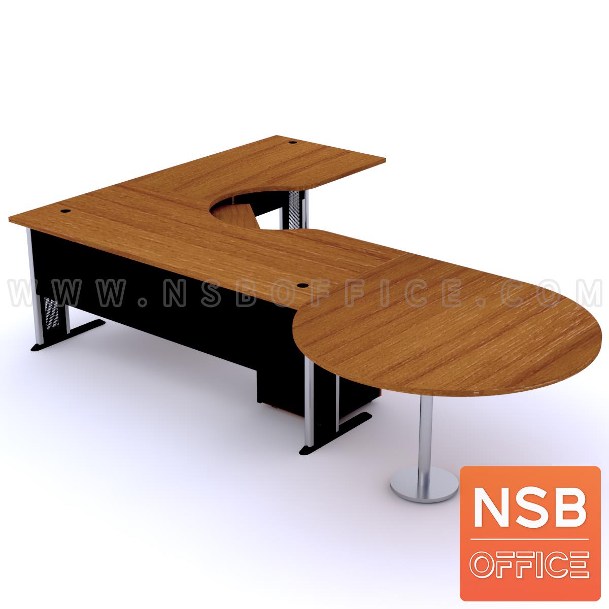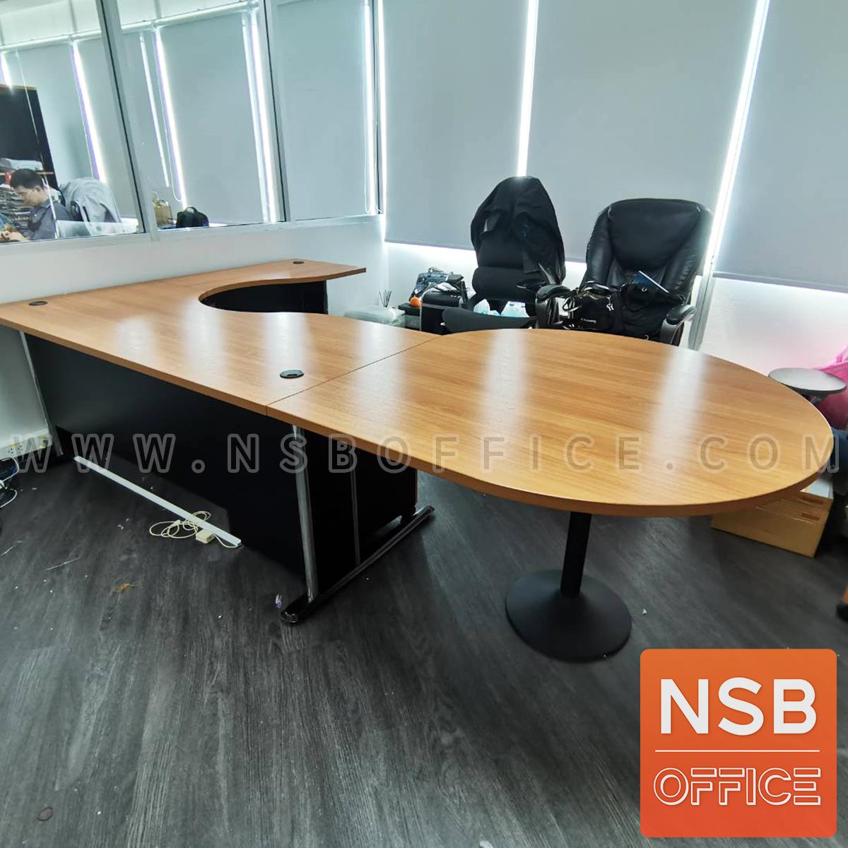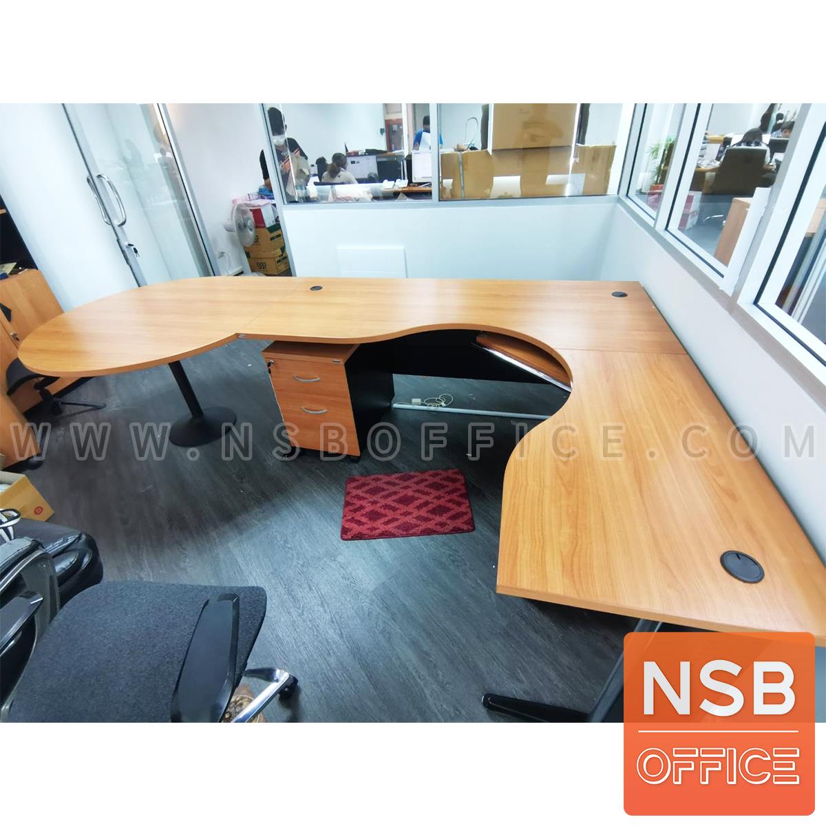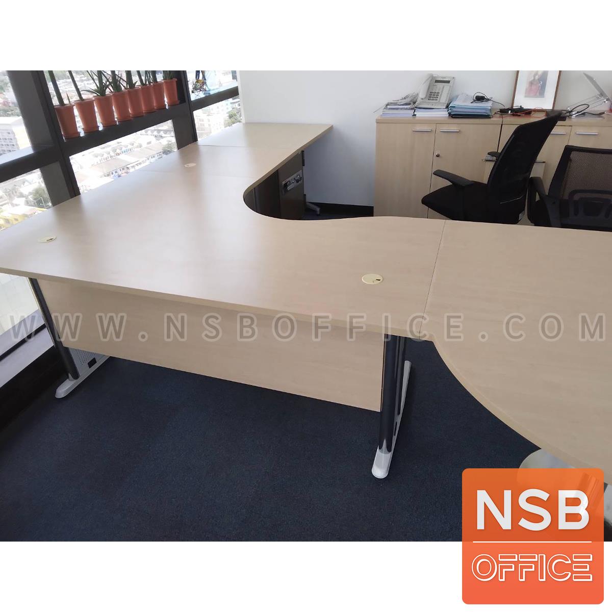 A13A032: โต๊ะผู้บริหารตัวแอลหน้าโค้งเว้า ขนาด 300W1*180W2 cm. ขาเหล็กโครเมี่ยมดำ สีเชอร์รี่-ดำ *แอลตามภาพเท่านั้น*