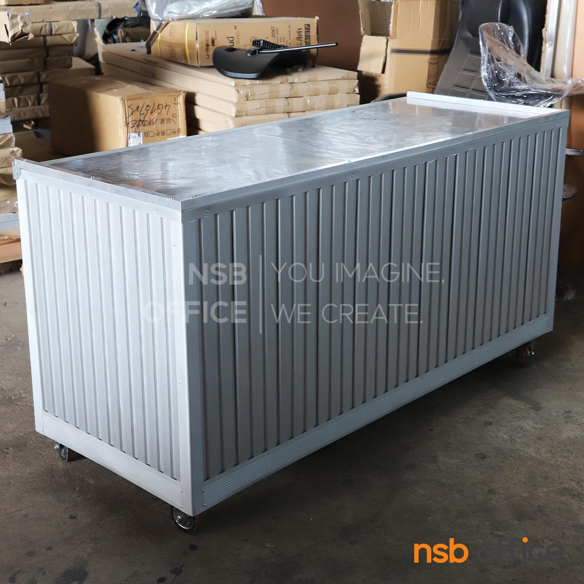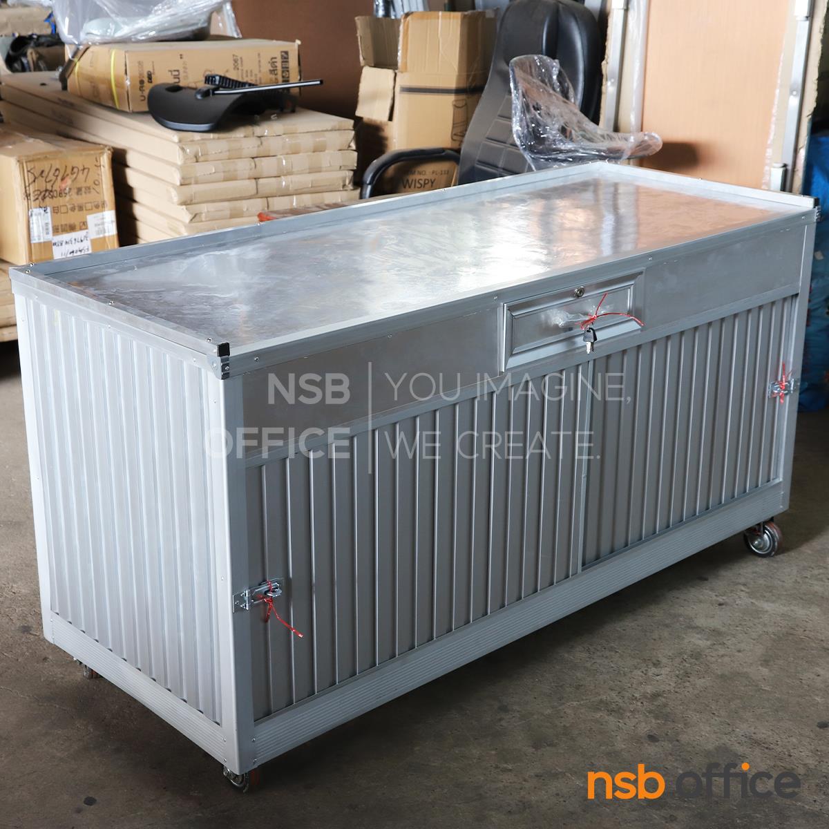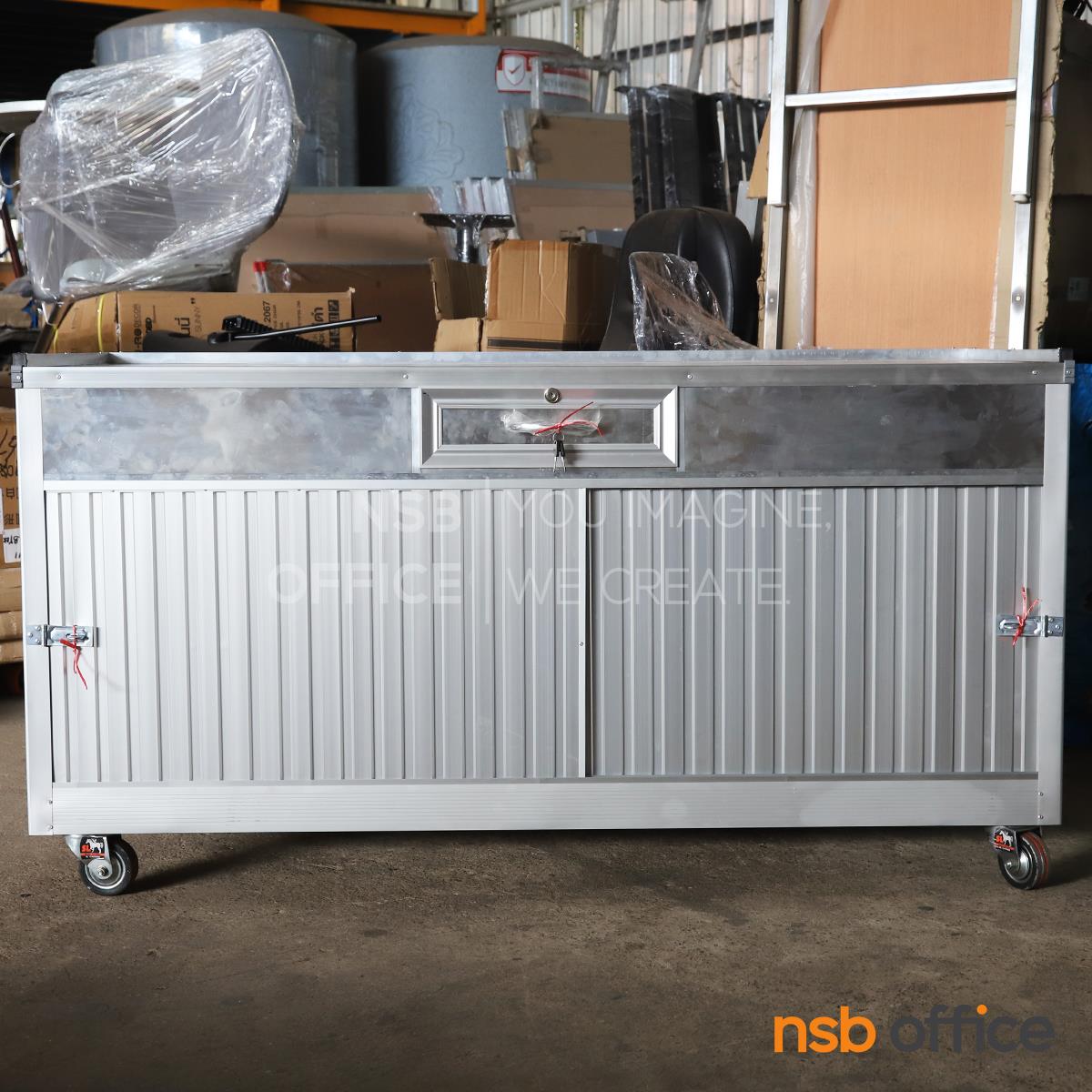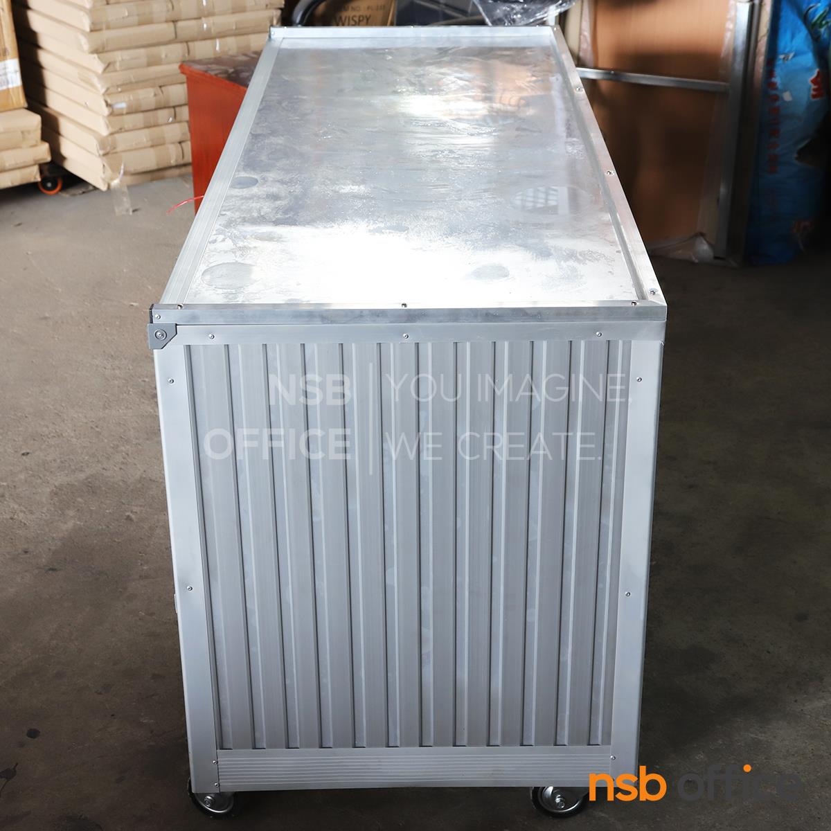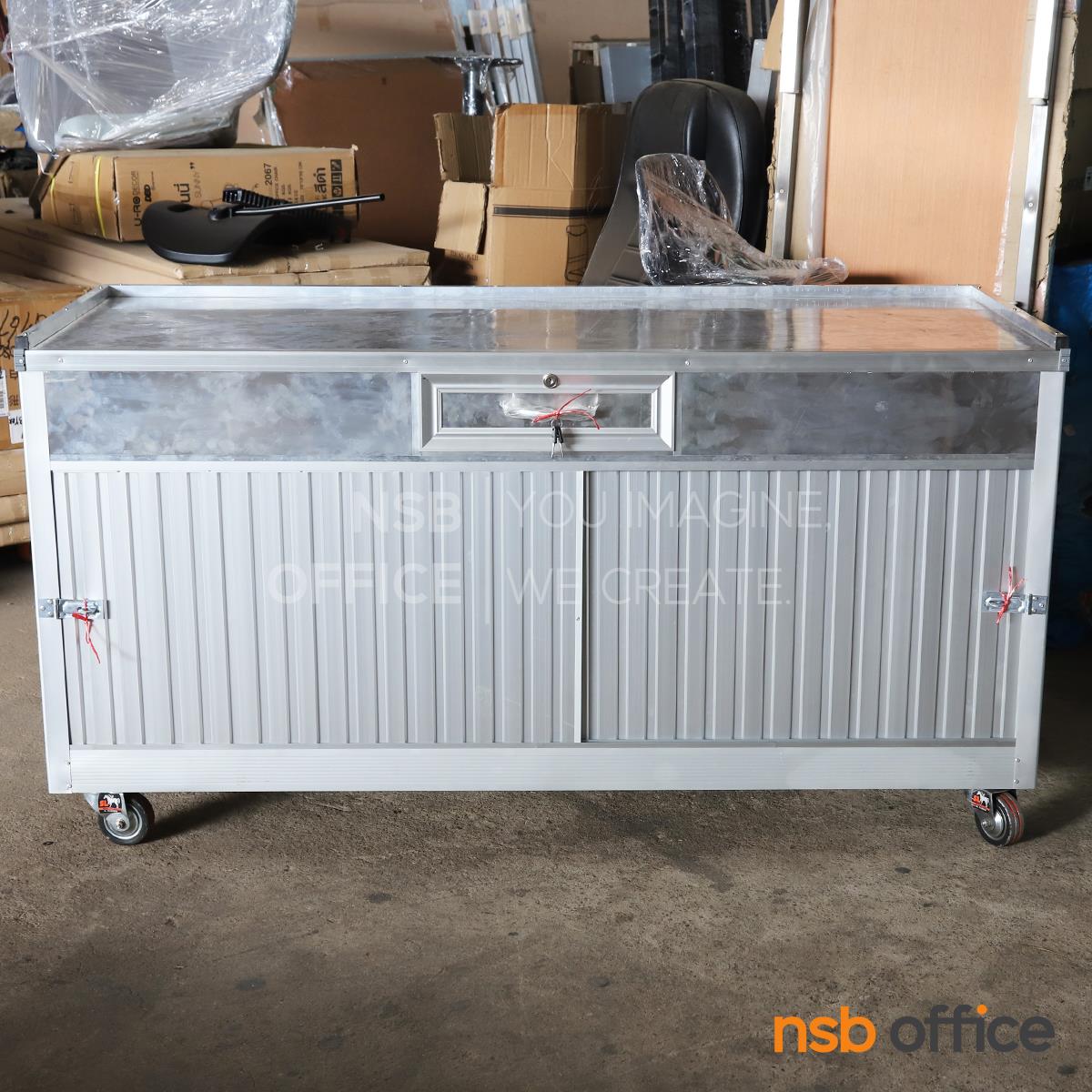 โครงผลิตจากอลูมิเนียมลูกฟูก มี 1 ลิ้นชักกลาง พร้อม 2 บานเลื่อน ล้อเลื่อน