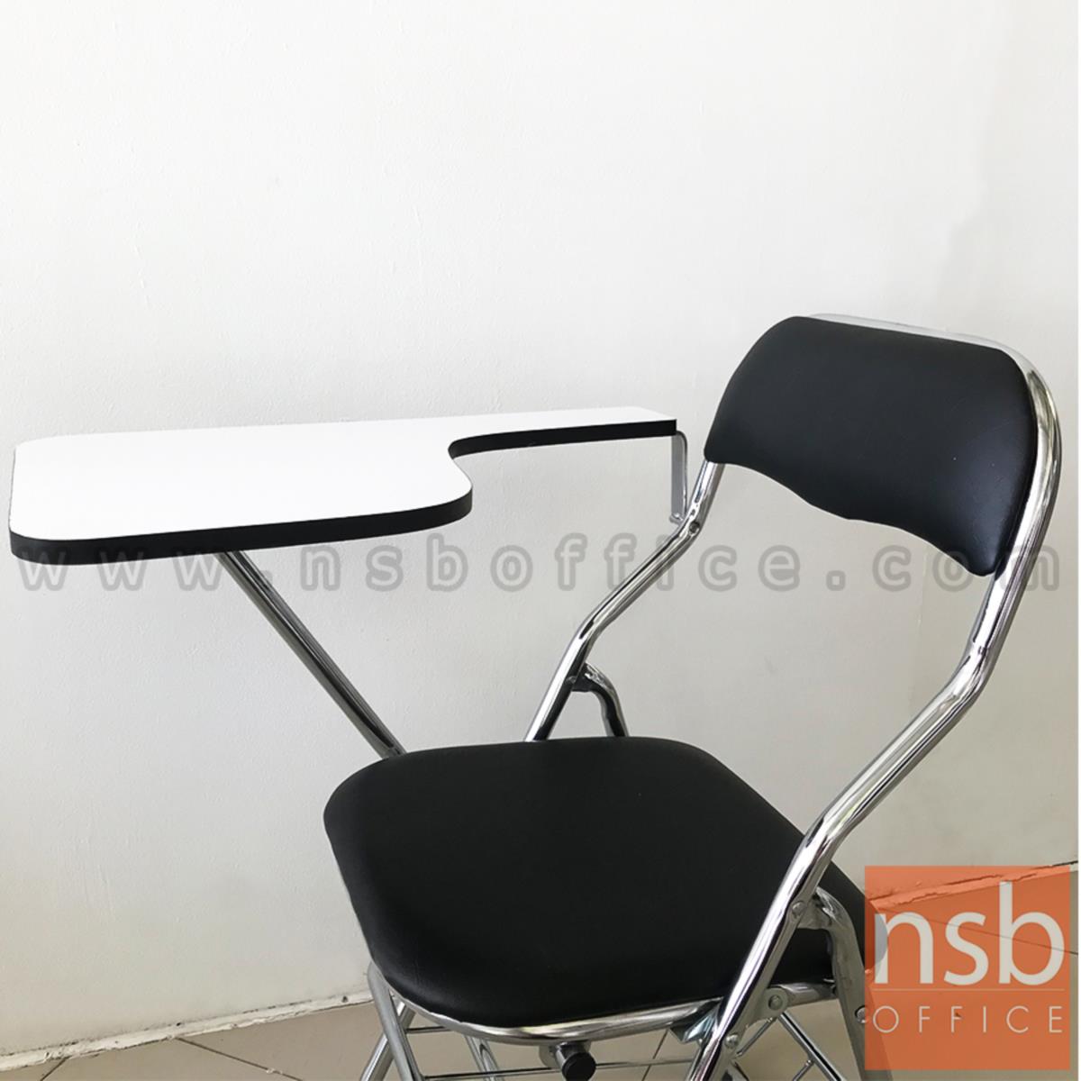 เท้าแขนแผ่นเลคเชอร์ของเก้าอี้อยู่ทางด้านขวา ออกแบบมาเพื่อการใช้งานสำหรับคนถนัดมือขวา
