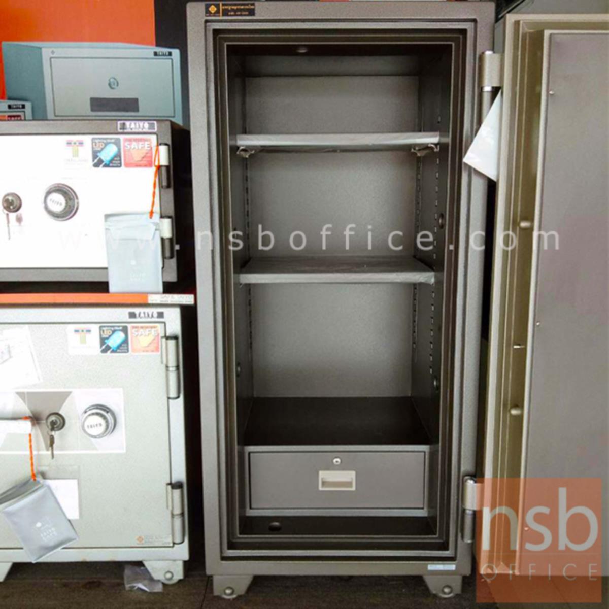 หน้าบานตู้มี 2 กุญแจ 1 รหัส ภายในมี 1 ลิ้นชักพร้อมกุญแจล็อคแยก และมี 2ถาดพลาสติก /ความจุ 169 ลิต สามารถกันไฟได้นาน 2 ชั่วโมง