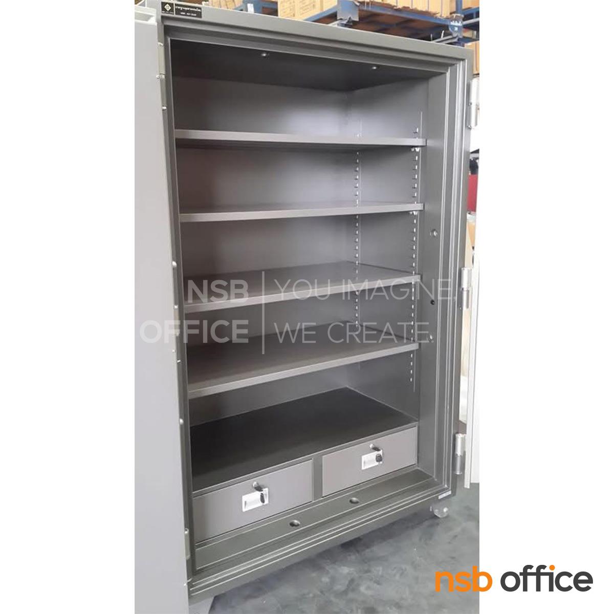 หน้าบานตู้มี 3 กุญแจ 1 รหัส ภายในมี 2 ลิ้นชักพร้อมกุญแจล็อคแยก และมี 4 แผ่นชั้น /ความจุ 420 ลิต สามารถกันไฟได้นาน 2 ชั่วโมง