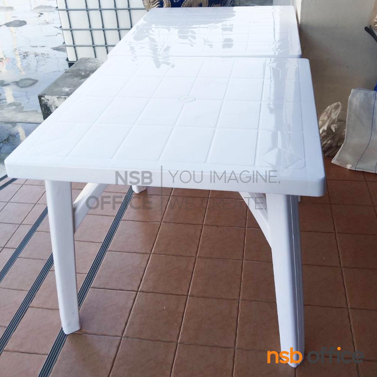 โต๊ะพลาสติกหนาพิเศษ หน้ากว้าง เหมาะสำหรับจัดตั้งในที่กลางแจ้ง มีพื้นเรียบตรงกลางสามารถเจาะรูและปักร่มกันแดดได้