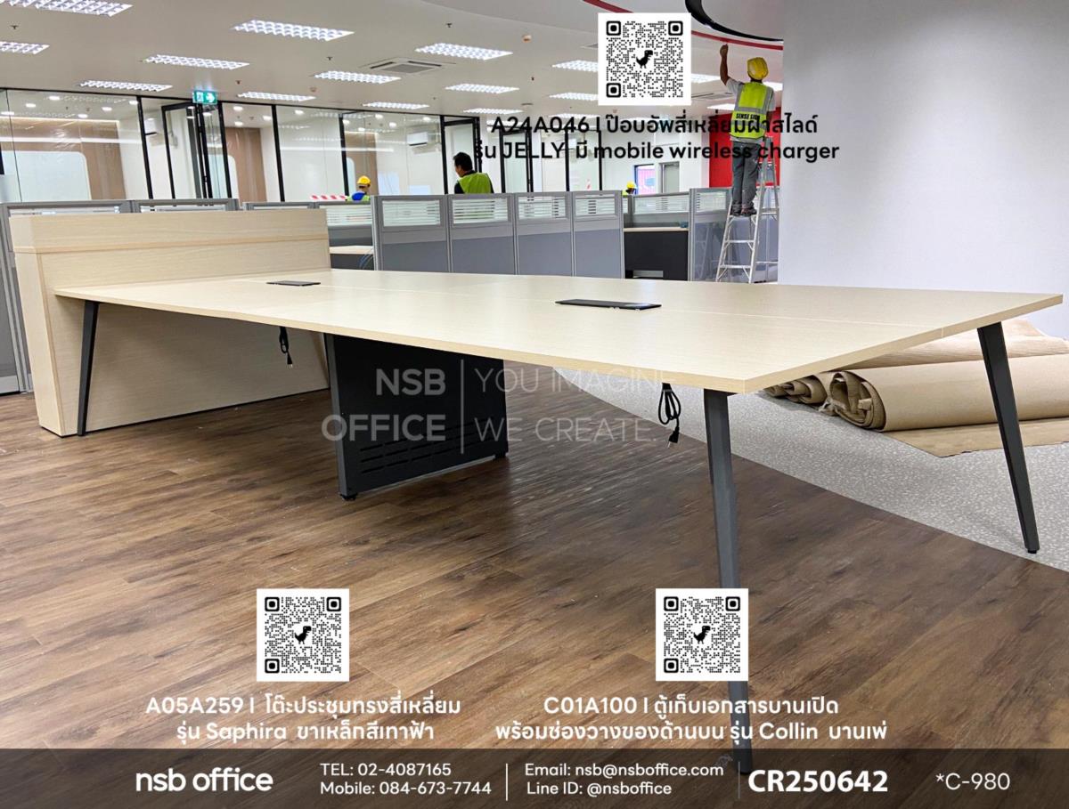 จัดส่งสินค้าเรียบร้อยแล้วค่ะ หน้างานนี้ลูกค้าได้เลือกซื้อโต๊ะประชุมทรงสี่เหลี่ยม รุ่น Saphira (ซาฟิร่า) รหัสสินค้า A05A259 เสริมด้วยตู้เก็บเอกสารบานเปิดพร้อมช่องวางของด้านบน รุ่น Collin (คอลลิน) รหัสสินค้า C01A100 ช่วยให้คุณจัดระเบียบเอกสารและอุปกรณ์ต่างๆ ได้อย่างมีระเบียบเรียบร้อย และป๊อบอัพสี่เหลี่ยมฝาสไลด์ รุ่น JELLY (เจลลี่) รหัสสินค้า A24A046 ไม่ว่าคุณจะจัดประชุมขนาดเล็กหรือใหญ่ โต๊ะนี้สามารถตอบโจทย์ทุกความต้องการของคุณได้อย่างลงตัวแน่นอนค่ะ