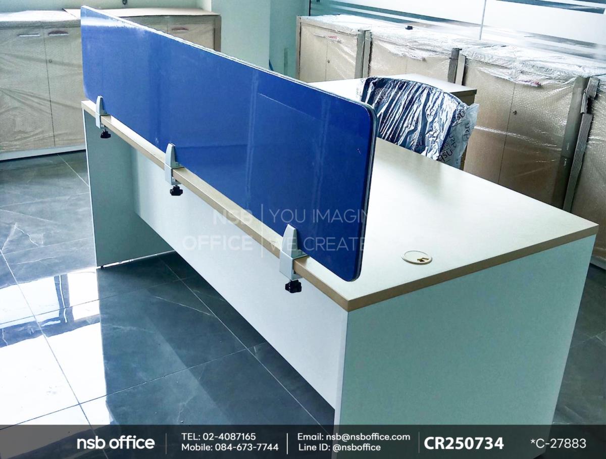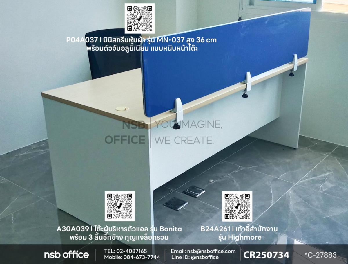 หน้างานนี้ลูกค้าได้เลือกซื้อโต๊ะผู้บริหารตัวแอล มาพร้อม 3 ลิ้นชัก รุ่น Bonita (โบนิต้า) รหัสสินค้า A30A039 สีเมเปิ้ลตัดขาว เสริมการใช้งานด้วย มินิสกรีนหุ้มผ้า รุ่น MN-037 รหัสสินค้า P04A037 ผ้าสีน้ำเงิน (CAT25) และใช้งานคู่กับเก้าอี้สำนักงาน รุ่น Highmore (ไฮร์มอร์) รหัสสินค้า C01A002 ค่ะ