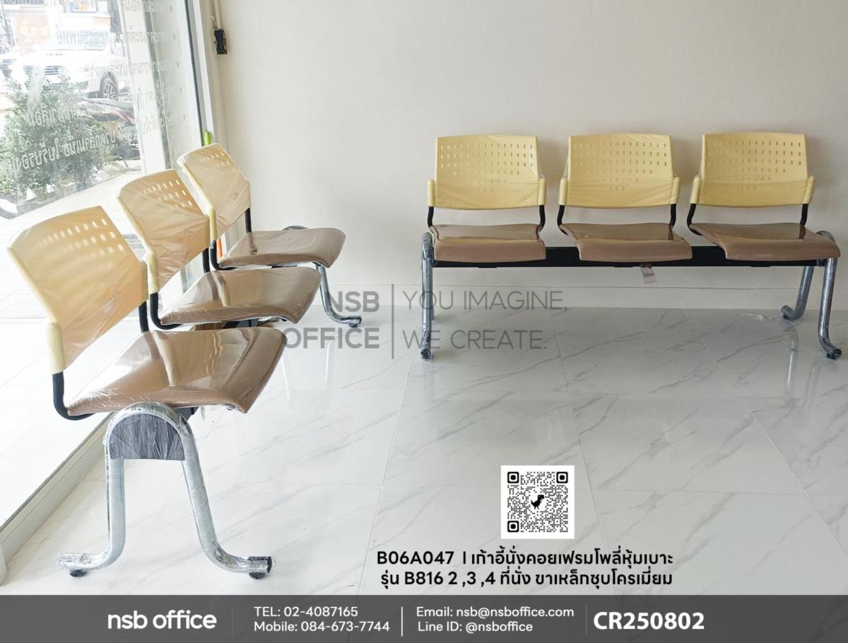 สำหรับโซนนั่งคอยแขก หากใครกำลังมองหาเก้าอี้นั่งคอยอยู่ทางเราขอแนะนำเป็นเก้าอี้นั่งคอยเฟรมโพลี่หุ้มเบาะรุ่น B816 ขาเหล็กชุบโครเมี่ยม รหัสสินค้า B06A047 โพลีครีม-เบาะสี PVC08 มีให้เลือกหลากหลายขนาด ดีไซน์ทันสมัย เหมาะสำหรับทุกสถานที่ ไม่ว่าจะเป็นสำนักงาน ร้านกาแฟ หรือห้องประชุม เฟรมโพลี่หุ้มเบาะให้ความนุ่มสบาย ขาเหล็กชุบโครเมี่ยมที่แข็งแรง ทนทาน เหมาะสำหรับการนั่งรอในสถานที่ต่างๆค่ะ