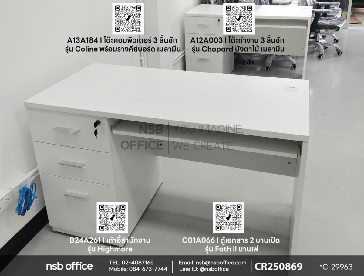 จัดส่งสินค้าเรียบร้อยแล้วค่ะ หน้างานนี้ลูกค้าได้เลือกซื้อโต๊ะคอมพิวเตอร์ 3 ลิ้นชัก รุ่น Coline (คอลินน์) รหัสสินค้า A13A184 และรุ่น Chopard (โชพาร์ด) รหัสสินค้า A30A073 มีลิ้นชัก 3 ช่องเพื่อการจัดเก็บที่สะดวกสบาย พร้อมเสริมตู้เอกสารเพื่อความเป็นระเบียบ เสริมการใช้งานด้วยตู้เอกสาร 2 บานเปิด รุ่น Fath ll (เฟธ 2) รหัสสินค้า C01A066 และเก้าอี้สำนักงาน รุ่น Highmore (ไฮร์มอร์) รหัสสินค้า B24A261 ค่ะ