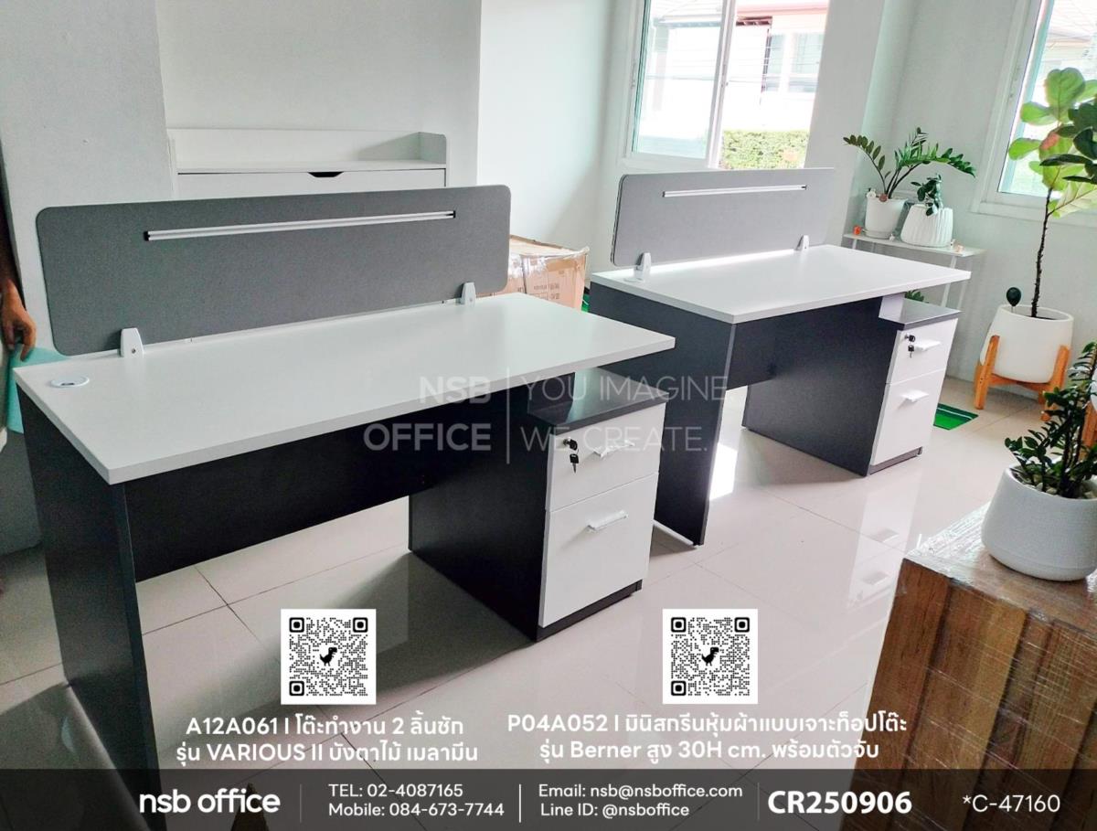 สำหรับหน้างานนี้เป็นโซนสำนักงาน ลูกค้าๆได้เลือกซื้อโต๊ะทำงาน 2 ลิ้นชัก รุ่น VARIOUS II รหัสสินค้า A12A061 รุ่นนี้จะมีบังตาไม้ สำหรับกันโป๊ เสริมการใช้งานด้วยมินิสกรีนหุ้มผ้าแบบเจาะท็อปโต๊ะ รุ่น Berner รหัสสินค้า P04A052 ผ้าสีเทาเข้ม ช่วยสร้างบรรยากาศที่เงียบสงบและเป็นส่วนตัว ทำให้คุณสามารถมุ่งมั่นกับงานได้อย่างเต็มที่ค่ะ